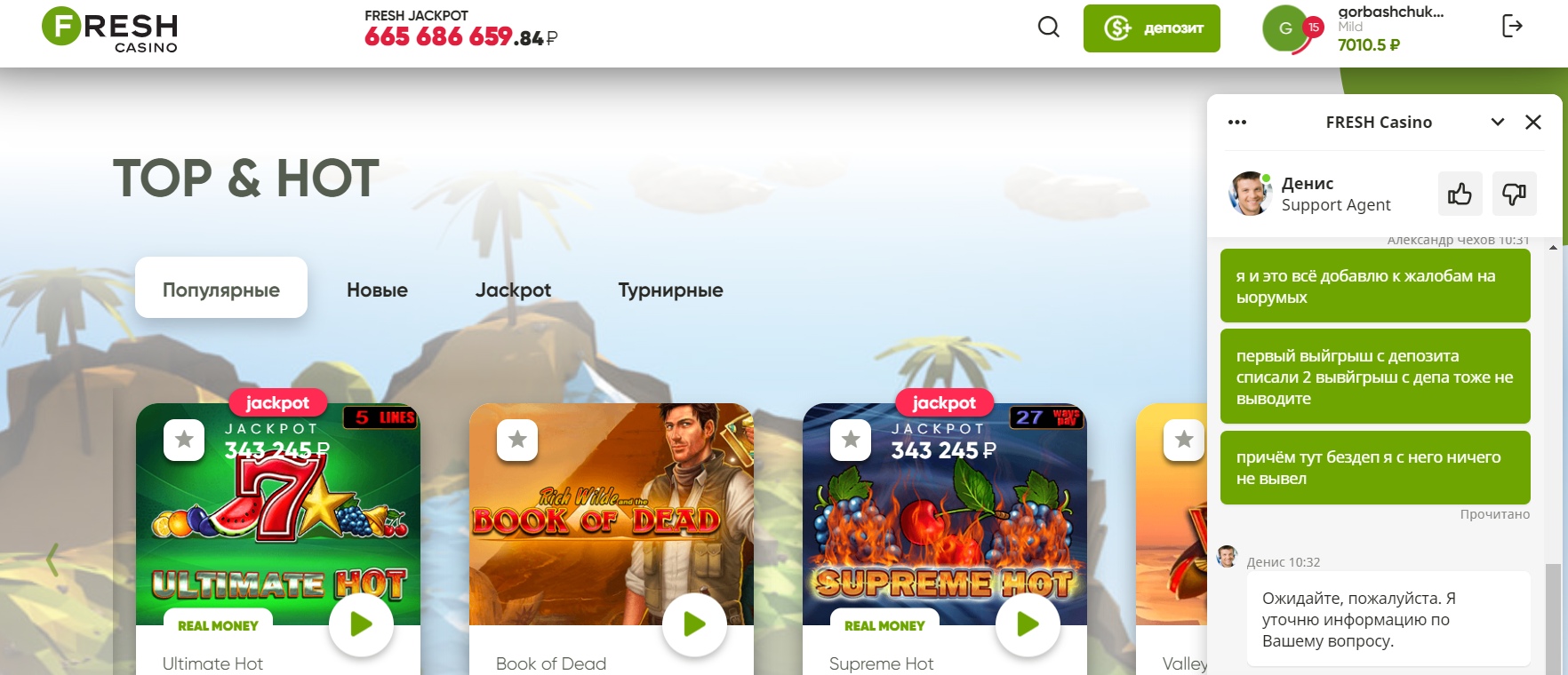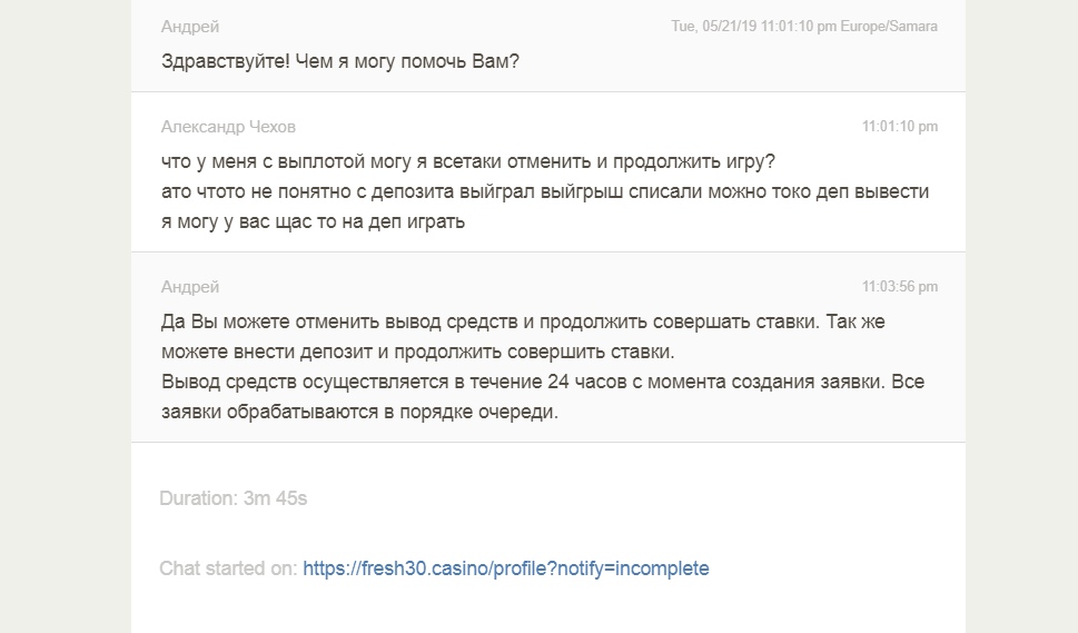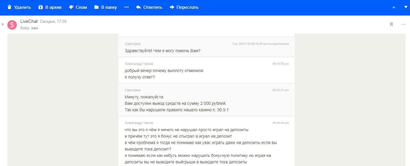 Здравствуйте решил вот поиграть в данном казино зарегистрировался у них получил бездепозитный бонус но не отыграл его решил играть на депозит сделал первый деп слил сделал 2 деп слил с 3 депа получилось выйграть все документы загрузил оформил вывод 30000 рублей через 5 минут выплоту отменяют и пишут что вы можете вывести тока свой депозит это правило относиться к бездепу данные в профиле не менял бездеп не отбил и нечего с него не вывел игра была на депозиты