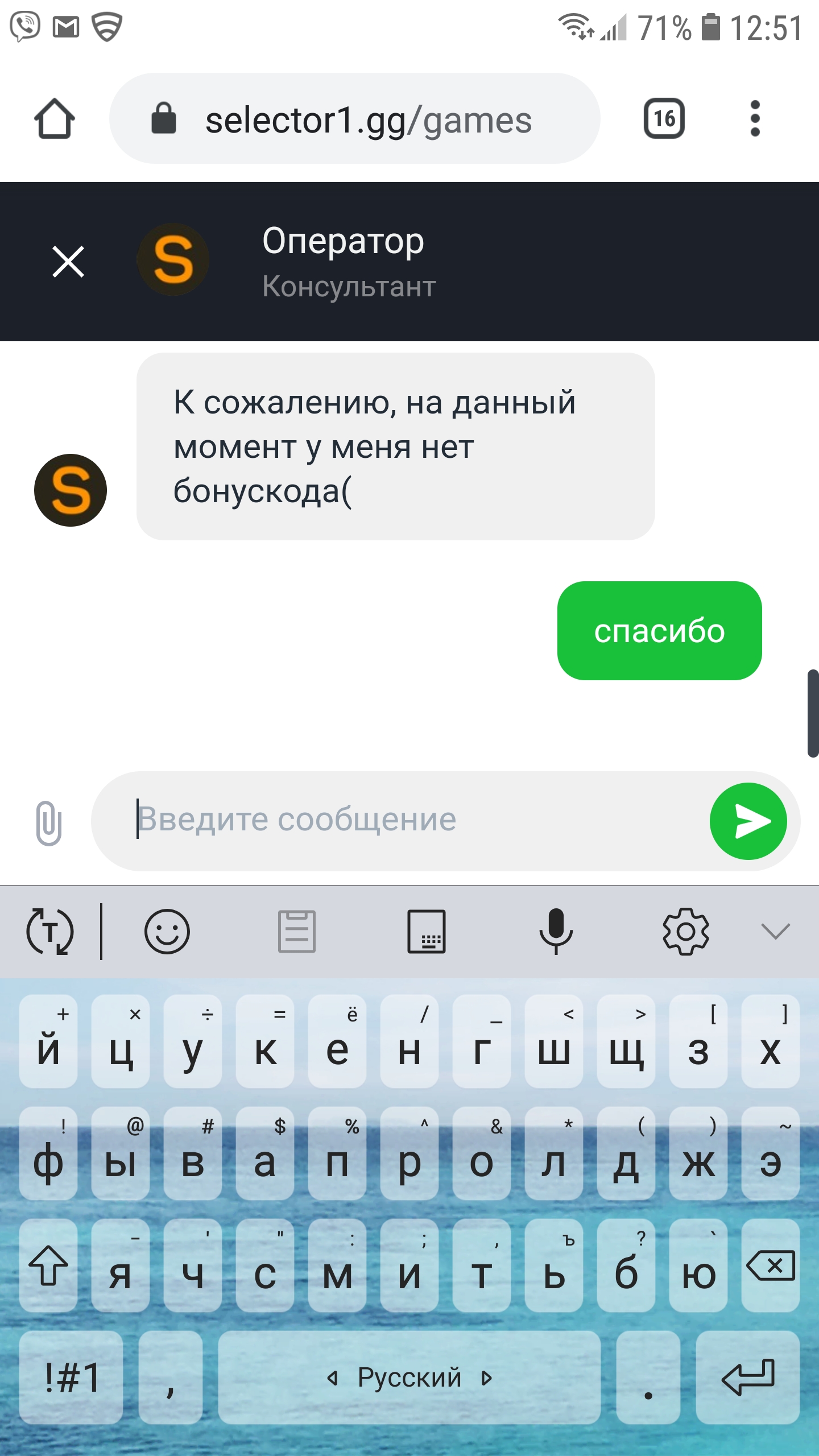 обратился в чат казино, говорю: на колесе не покатаешься)) может есть купончик= дали код на 12 руб. :boast: