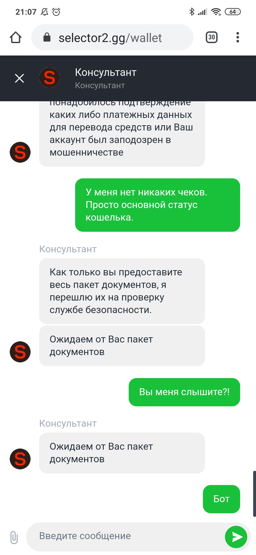 Вопрос к представителю Селектора. Выиграл с колеса 1к рублей, поставил на вывод. Отменили. Обратился в чат, сказали нужно пройти верификацию через форму. Форма не активна, пишет что верификация не нужна. Теперь чат молчит. Что происходит? И вопрос к форумчанам, от кого-то ещё требовали пройти верификацию? Суммы вывода как и депозиты были мелкими, с какого перепугу меня подозревают в мошенничестве?