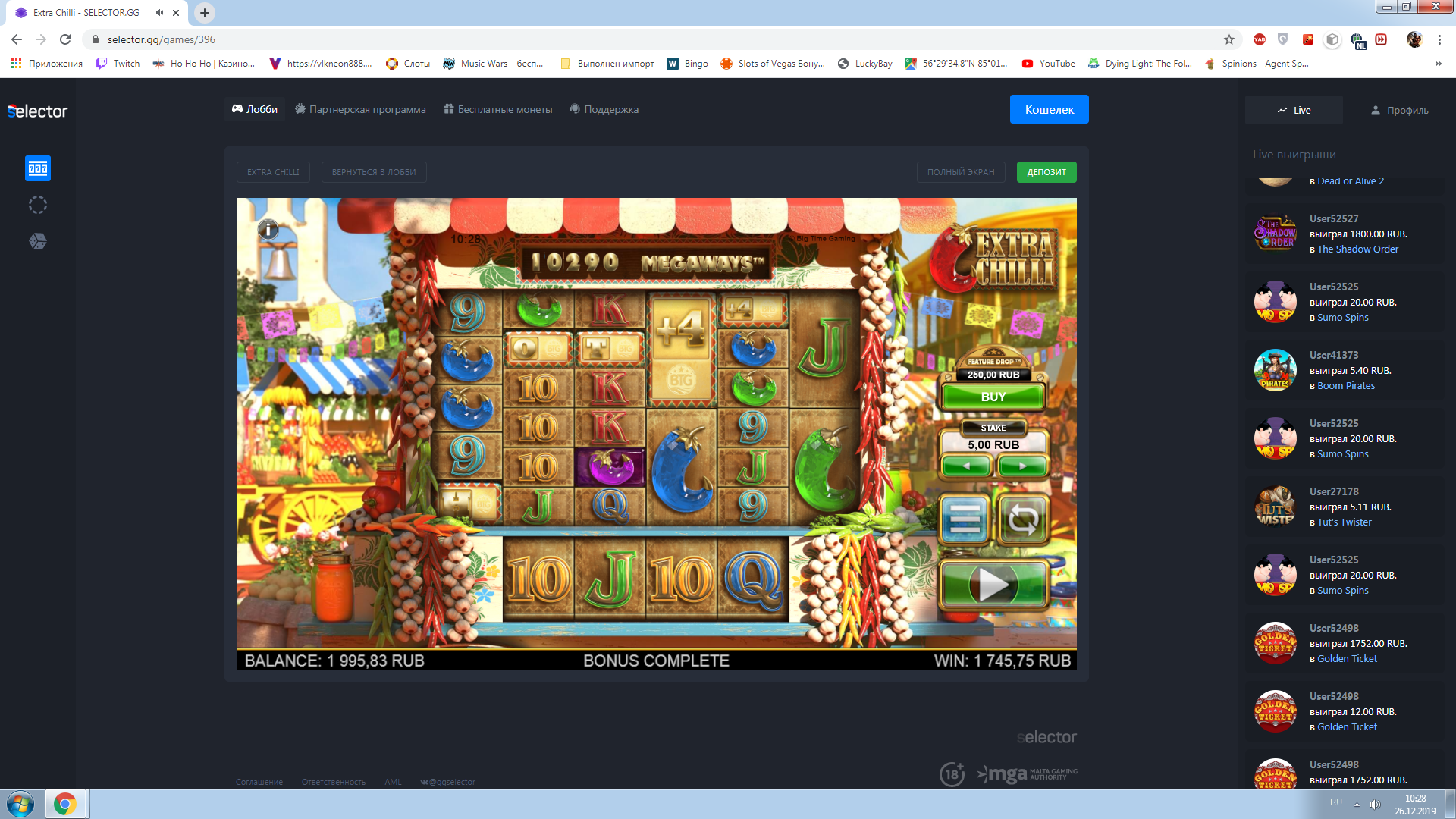 Получите 20 бесплатных вращений по 20 RUB. в слоте Santa Vs Rudolf за депозит от 2020 RUB. (только один раз). Акция действует с 31.12.2019 02:00 по 02.01.2020 23:59. Бонус не нужно отыгрывать (только правило оборота х1.5), он просто добавляется к вам на баланс после отыгрыша вращений.