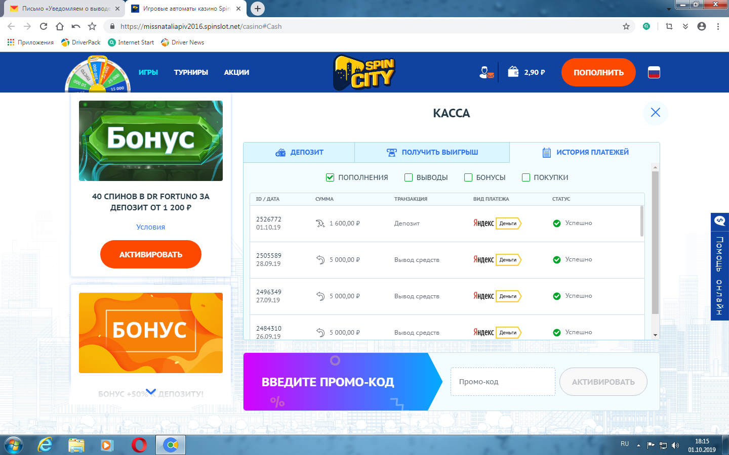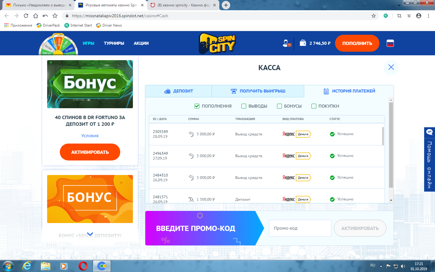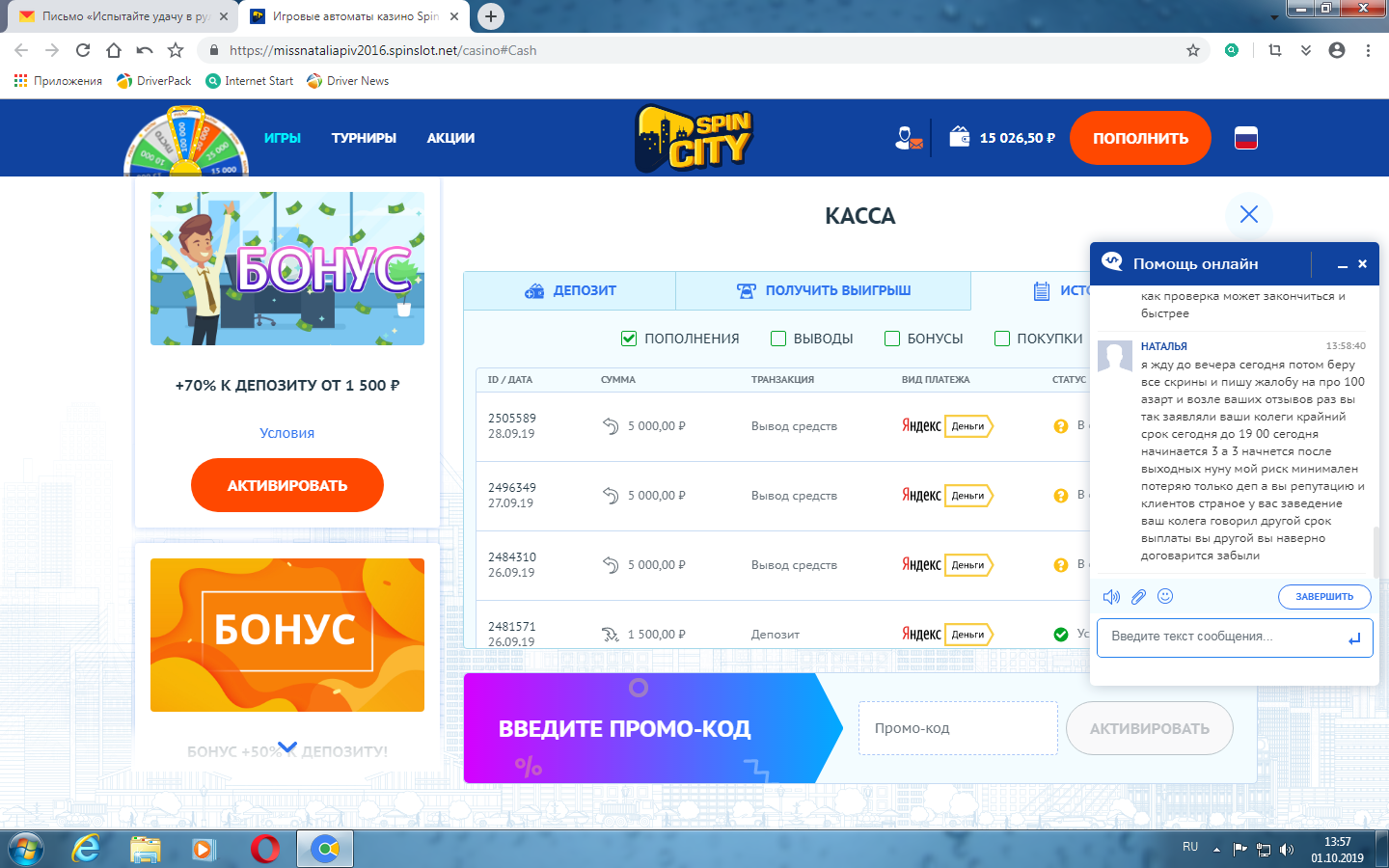 вобщем ситуация такая с 26 09 2019 года весят заявки на вывод в казино спинсити 3 заявки по 5к каждая не выводят кормят завтраками тех проблемы то у них то нужнобольше времени на проверку аккаунта сначала была заявлена дата 01102019года крайний срок для вывода теперь уже 03102019года аккаунт давненько до етого проблем не было особых делала депы делали выводы только долго каждый раз дня3 теперь прошло 5 после создания заяки причем 3 рабочих а вывода нет и говорят еще надо 2дня им имею скрины заявок а также переписки с оператором в чате меняют сроки на выплату каждый день