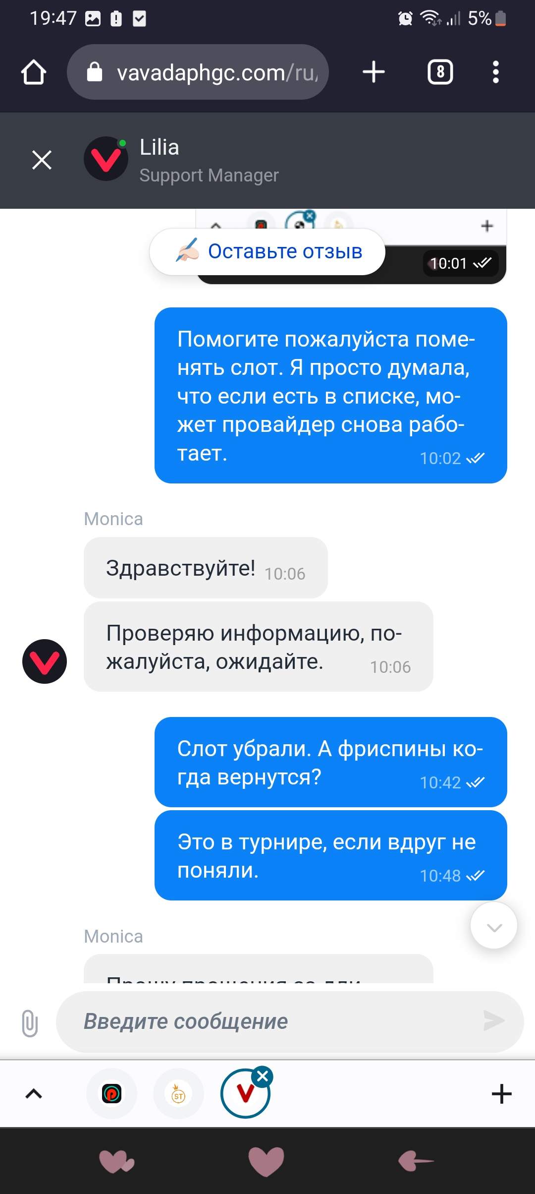 Там был слот от пуш, думала что может для турнира доступен, зашла и фриспины потратила и через 2 минуты слот удалили. 3 часа до конца турнира никто ничего не исправил. Поддержка игнорит. И весь чат в турнире с такой проблемой. Либо вообще не получили фс, либо открутили 0 остался, кто-то докупил попытки и ничего не получил.