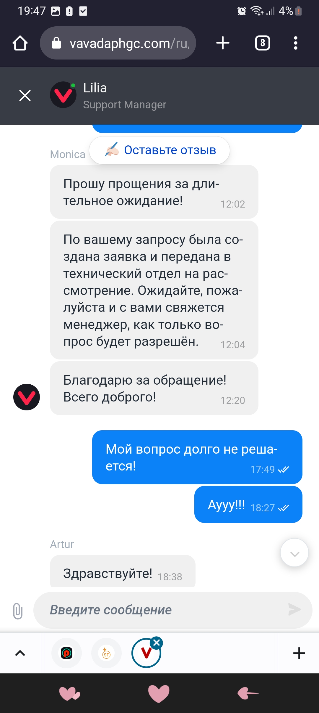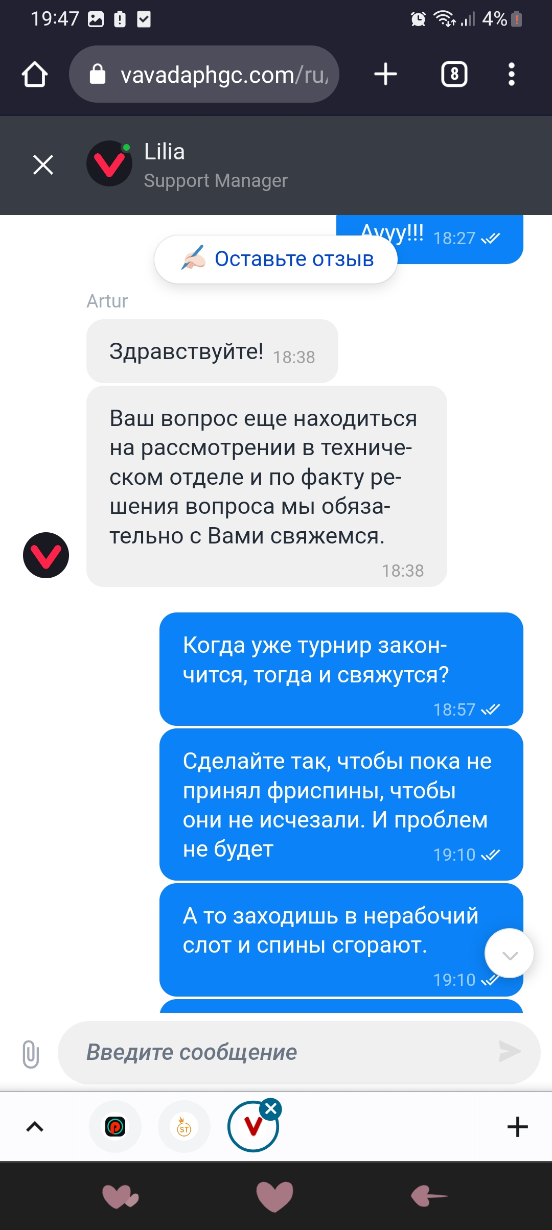Сразу в 10 утра вчера написала в поддержку ответ 1: ожидайте с вами свяжутся и до сих пор тишина. Обсуждали эту проблему в чате и там забанили, кого-то в вк в чс добавили.