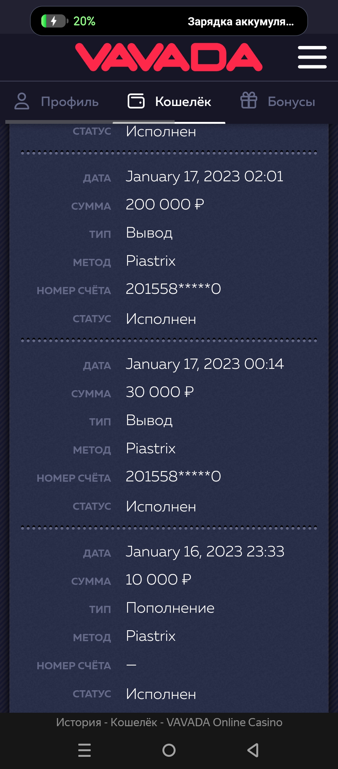 Забыл похвалиться. В начале года депнул 10к, начались качели 4-12к примерно баланс скакал. Под вечер подвыпил, крутил вертел чего-то там и уснул. Почему-то думал, что слил баланс, настроение такое отвратное было, даже заходить никуда не хотелось. К обеду шкура буграми начала ходить, давай копейки проверять где чего осталось. Зашел в ваваду, а там примерно 10к с копейками оставалось. До 10к выравнил в монгола чтоли в линию по рублей 20 крутил, ничего не дало. Пошел в РоялИксмас эндорфины. Ставку на 200р зарядил и купил бон самый дешманский, сыпануло 450к руб. Вывели очень быстро, ни верифа, ничего не спросили, даже не грузил там ни разу никакие доки. Септик дома хватило настроить, с водой разобраться и отоплением, на остатки с братом сложились лодку купили бу и мотор ямаху тридцатку, на 40 не хватило ( цены в космос взлетели на япов. Такая история. Топ казино в моем списке, ни разу ни малейших придирок не было или проблем, удивили что верифа ни разу не было, даже при такой не малой сумме для меня.