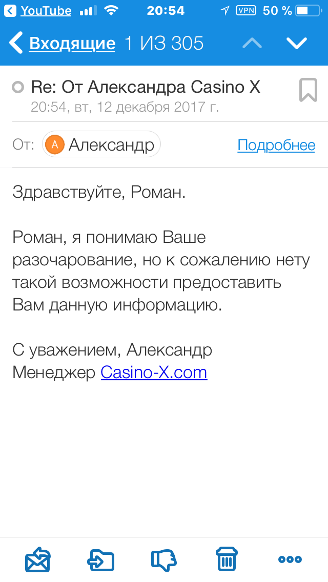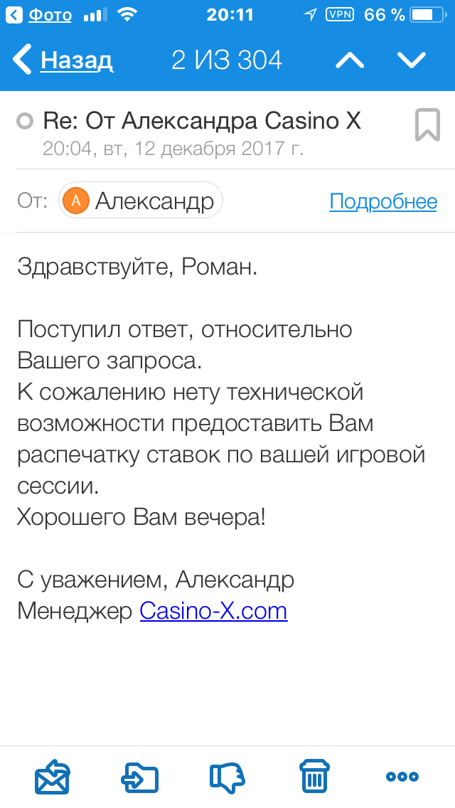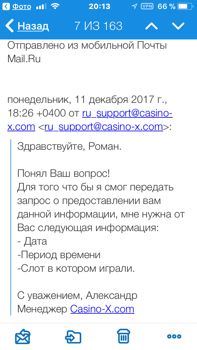 казино х меня сегодня удивило с отрицательной стороны .попросил я у них еще день назад чтобы мне выслали историю игры в определенном слоте .в день и час который я им указал . у меня есть видео бонусной игры с заносом . а что было до него я не записывал . а то что была тут у нас с benya11, не хорошая ситуация . я запросил у казино историю и получил вот такой ответ от них ...... хотя в казино Loki я получал отчет такой . к чему я это всё написал. случись ситуация как у меня выложив скрин игры по 10К руб за спин . казино отказывает в истории игры .этим лишает любого из нас в пруфов для публичного показа и подтверждения наших действий в определённое время игры в казино . знатоки подскажите что вы думаете по этому поводу ?
