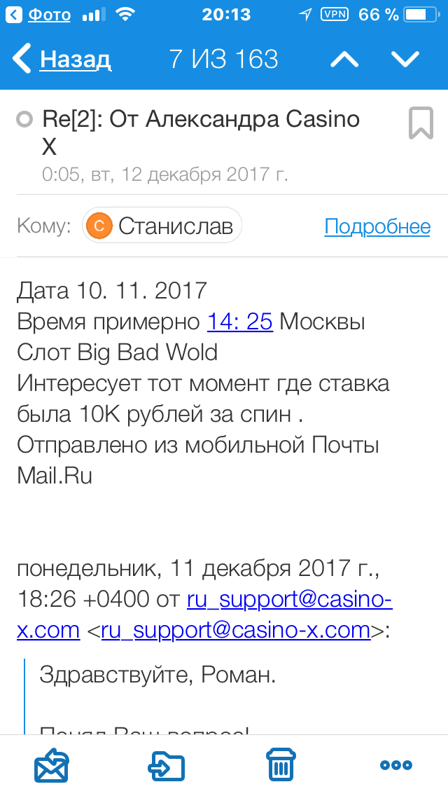 казино х меня сегодня удивило с отрицательной стороны .попросил я у них еще день назад чтобы мне выслали историю игры в определенном слоте .в день и час который я им указал . у меня есть видео бонусной игры с заносом . а что было до него я не записывал . а то что была тут у нас с benya11, не хорошая ситуация . я запросил у казино историю и получил вот такой ответ от них ...... хотя в казино Loki я получал отчет такой . к чему я это всё написал. случись ситуация как у меня выложив скрин игры по 10К руб за спин . казино отказывает в истории игры . знатоки подскажите что вы думаете по этому поводу ?