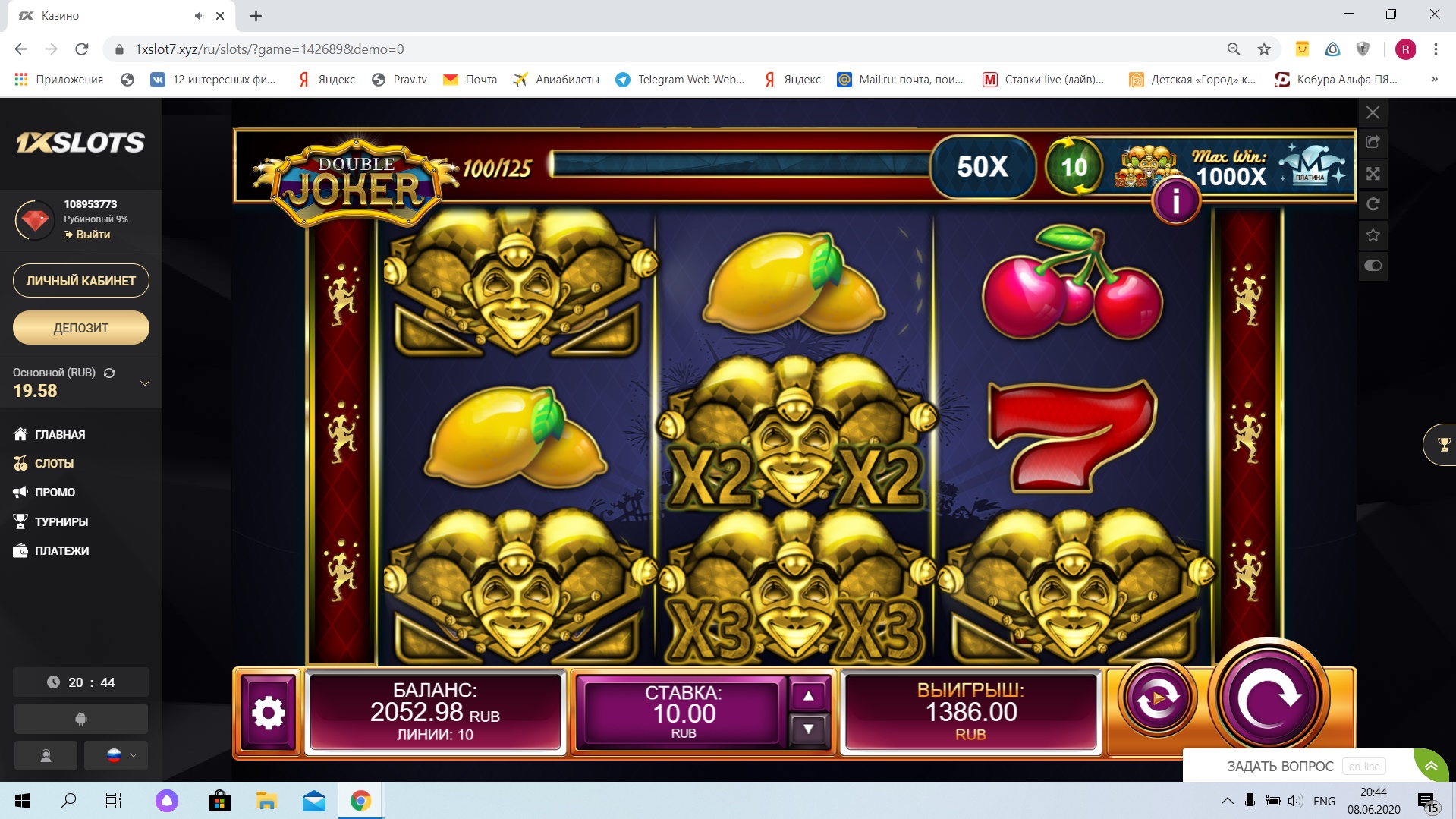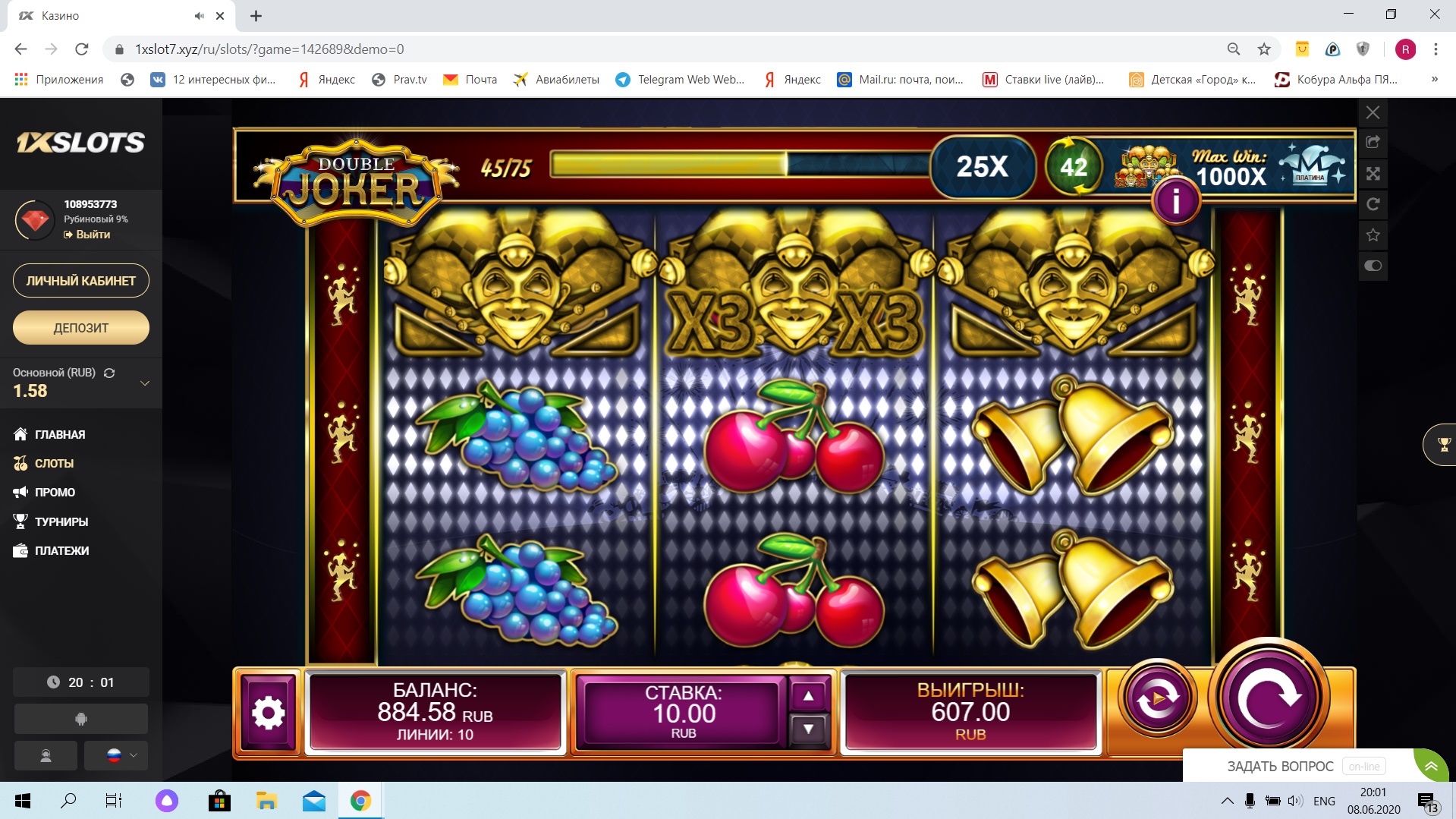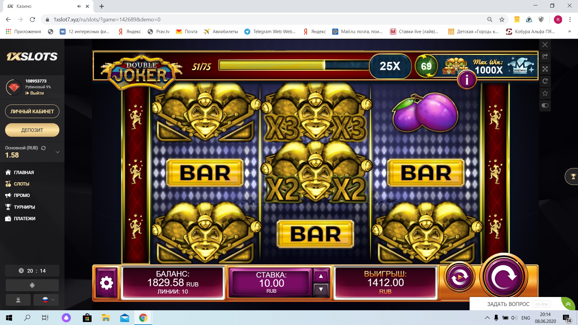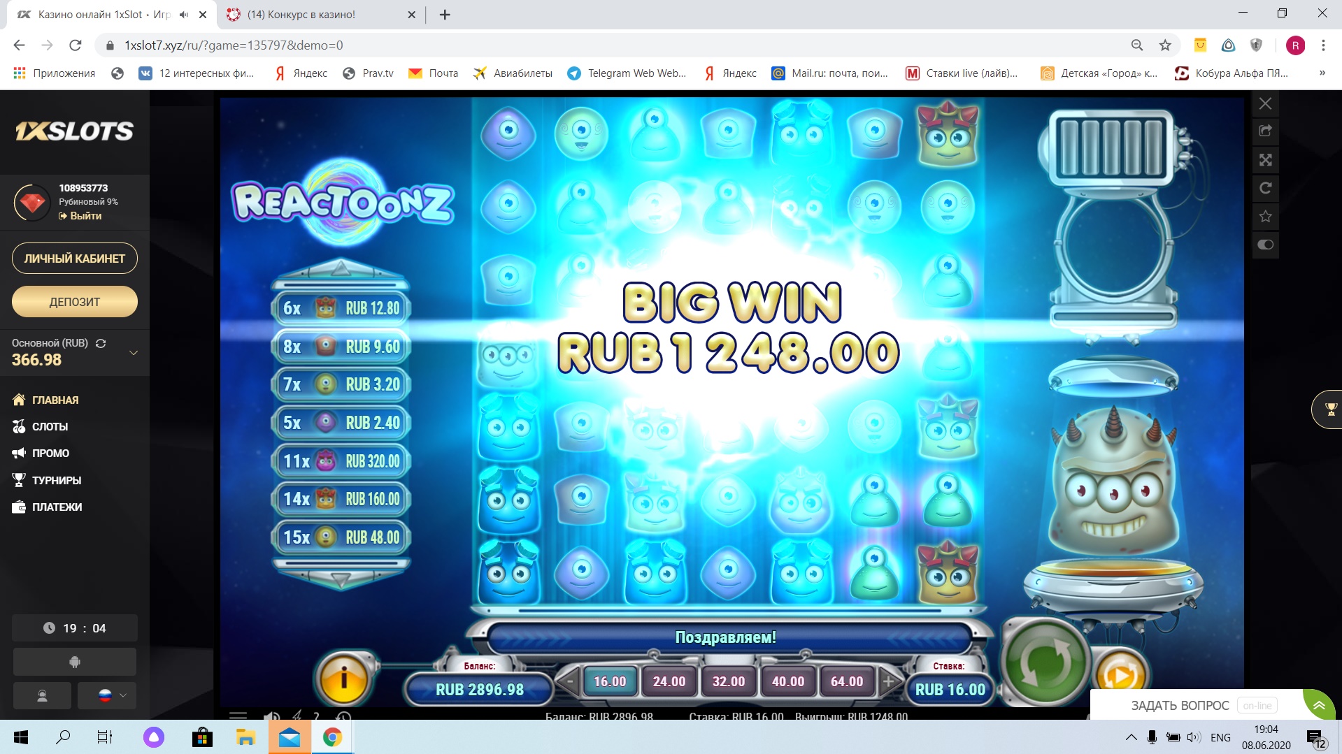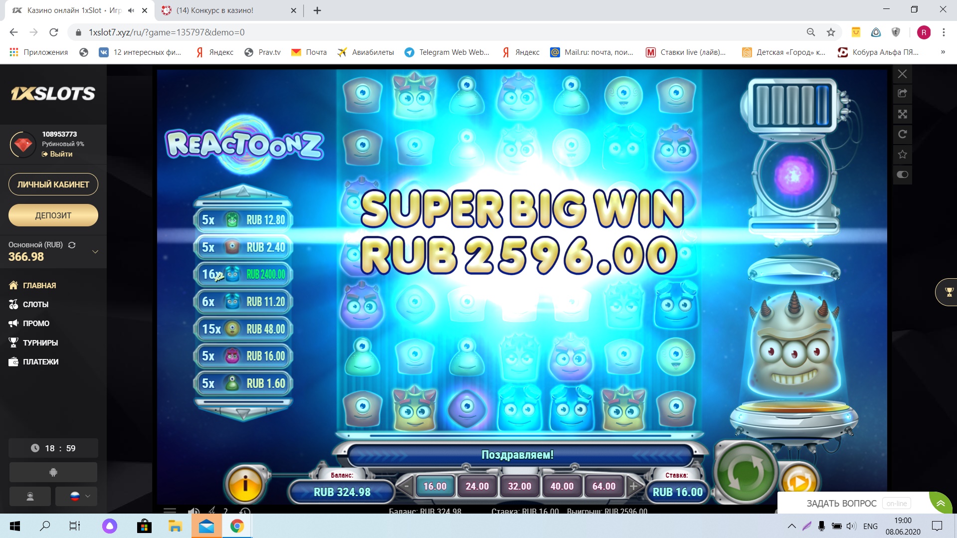 06.06.2020 22:31:24 1554,00 Выплата RedTiger (ставка 14 рублей)