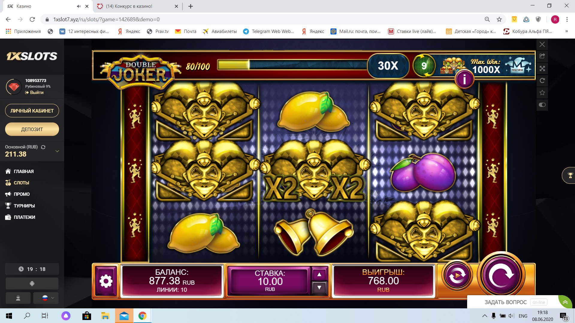 Номер счёта 188583527 . Время 19:33 19:42Ставка 10 x 84, x65
