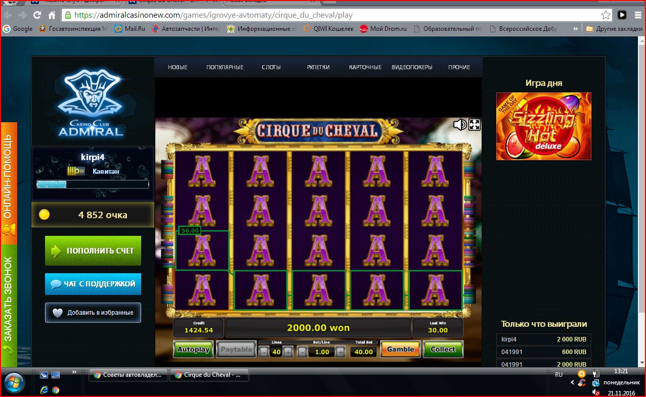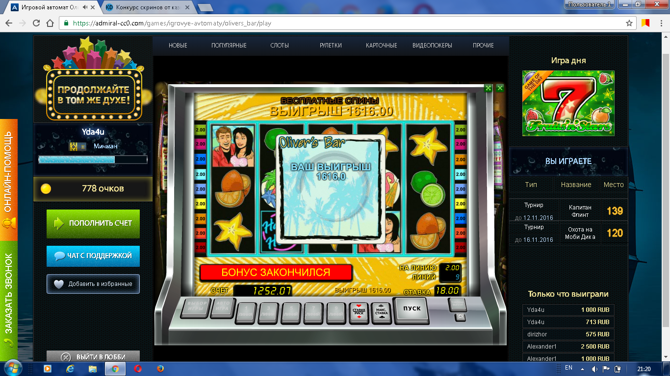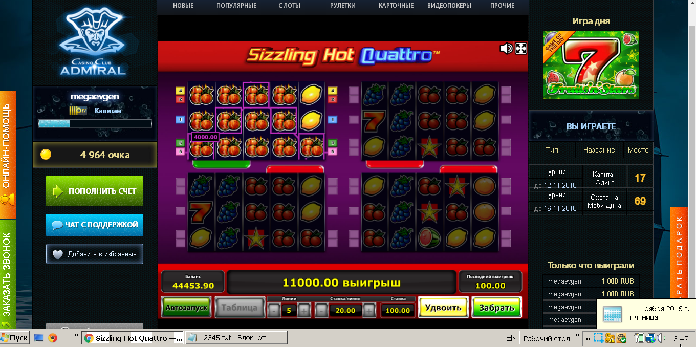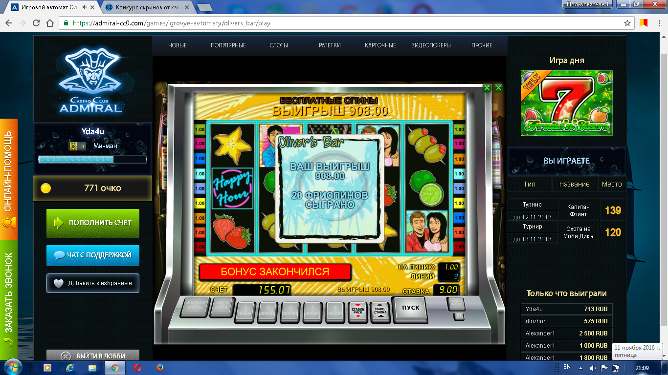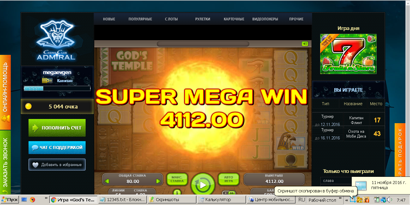 Завершилась очередная неделя конкурса скринов от казино Адмирал, в этот раз призовые места распределились так: