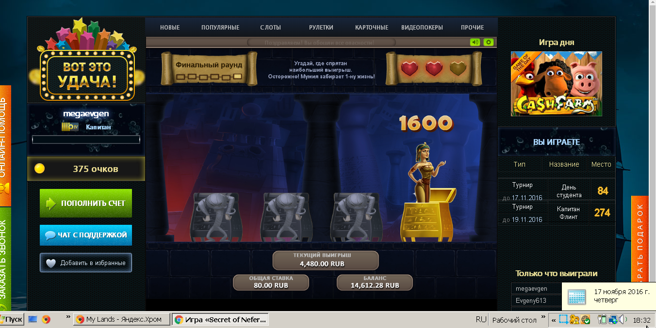На этой неделе леди Удача была очень благосклонна к бегуПОграблям, игра Lucky Lady’s Charm принесла ему 16.470 рублей при ставке 18 рублей за вращение, а соотношение выигрыш/ставка составило 915 к 1: :)