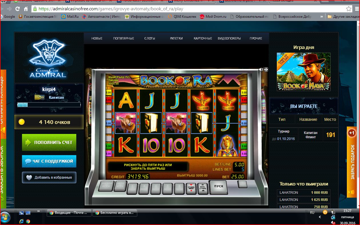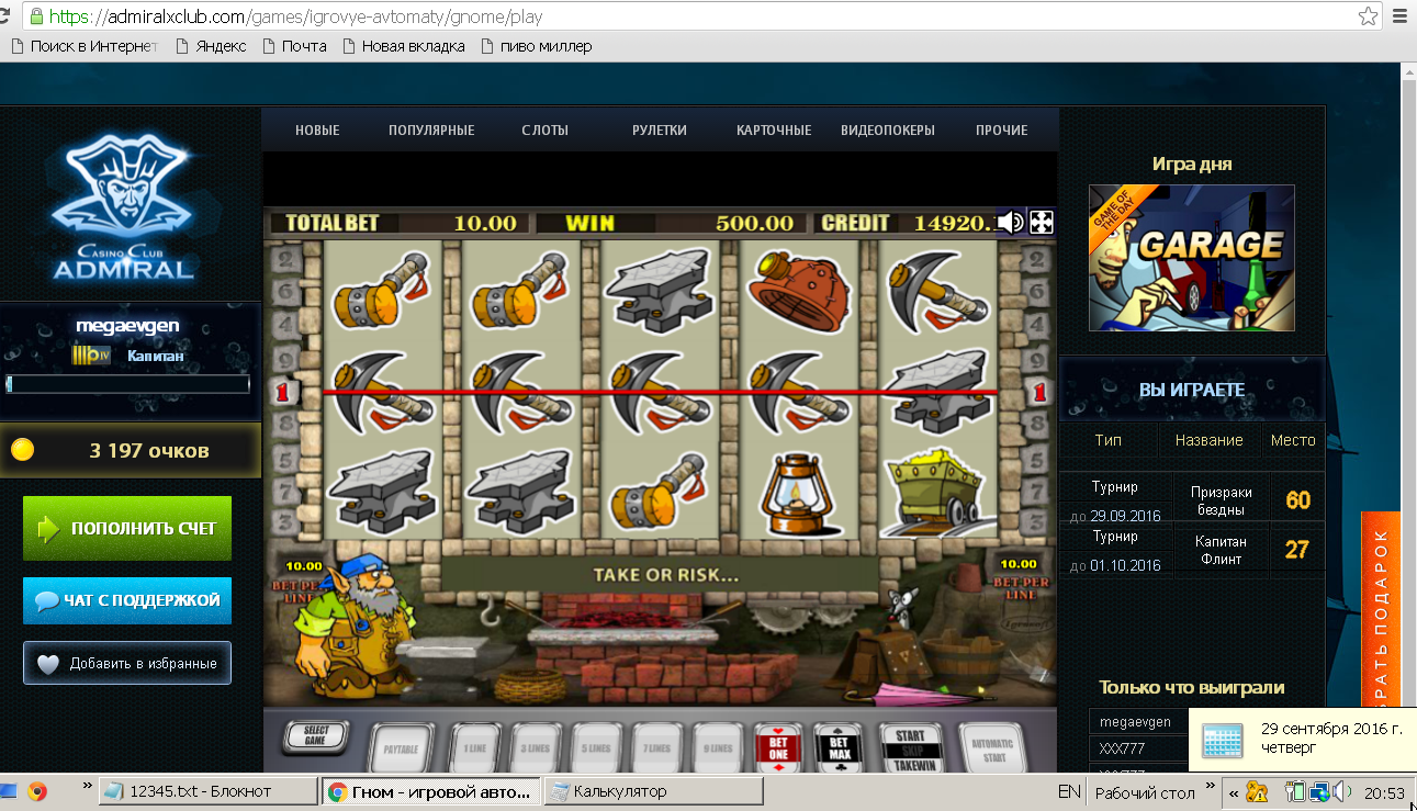 Megaevgen, скрин сделан в риск-игре, я уже поясняла, что стартовая ставка в каждом раунде равна выигрышу в предыдущем. Т.е. если вы удвоили до 20К, то стартовая сумма была 10К и т.д. Поэтому неверно считать 100 рублей как первоначальную ставку.Спасибо Адмиралу за щедрость. А вот лучший скрин у меня был 200 к 1 в Алькатрас(ставка 100, выигрыш 20000)