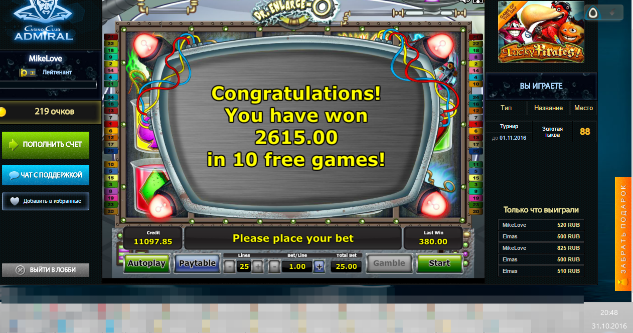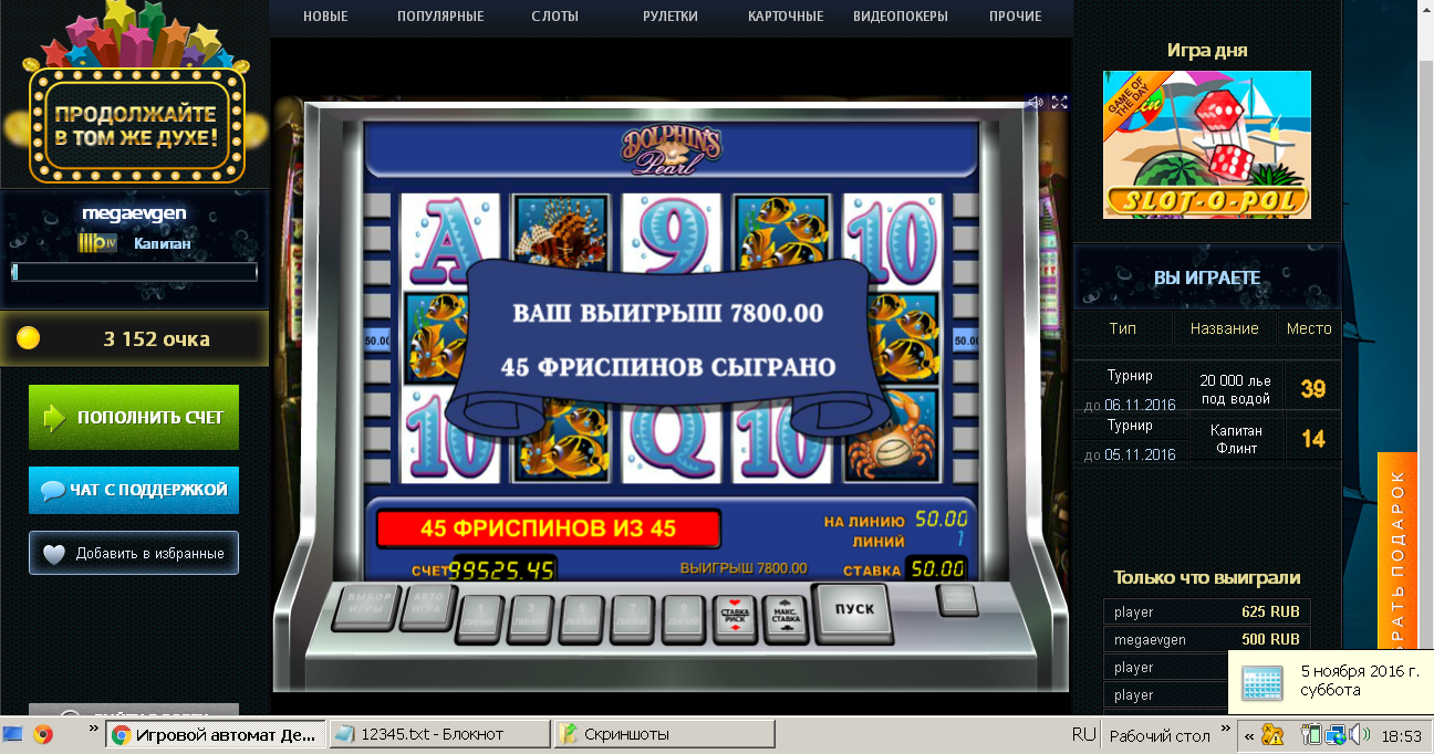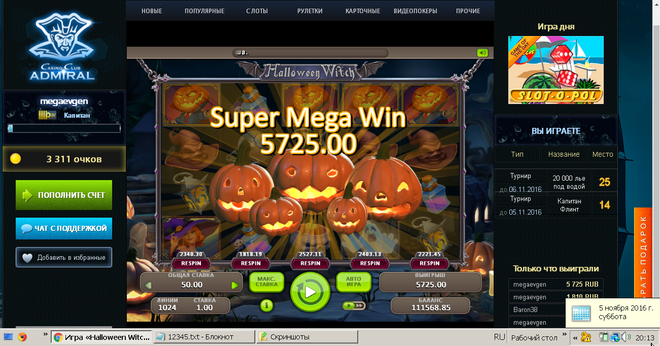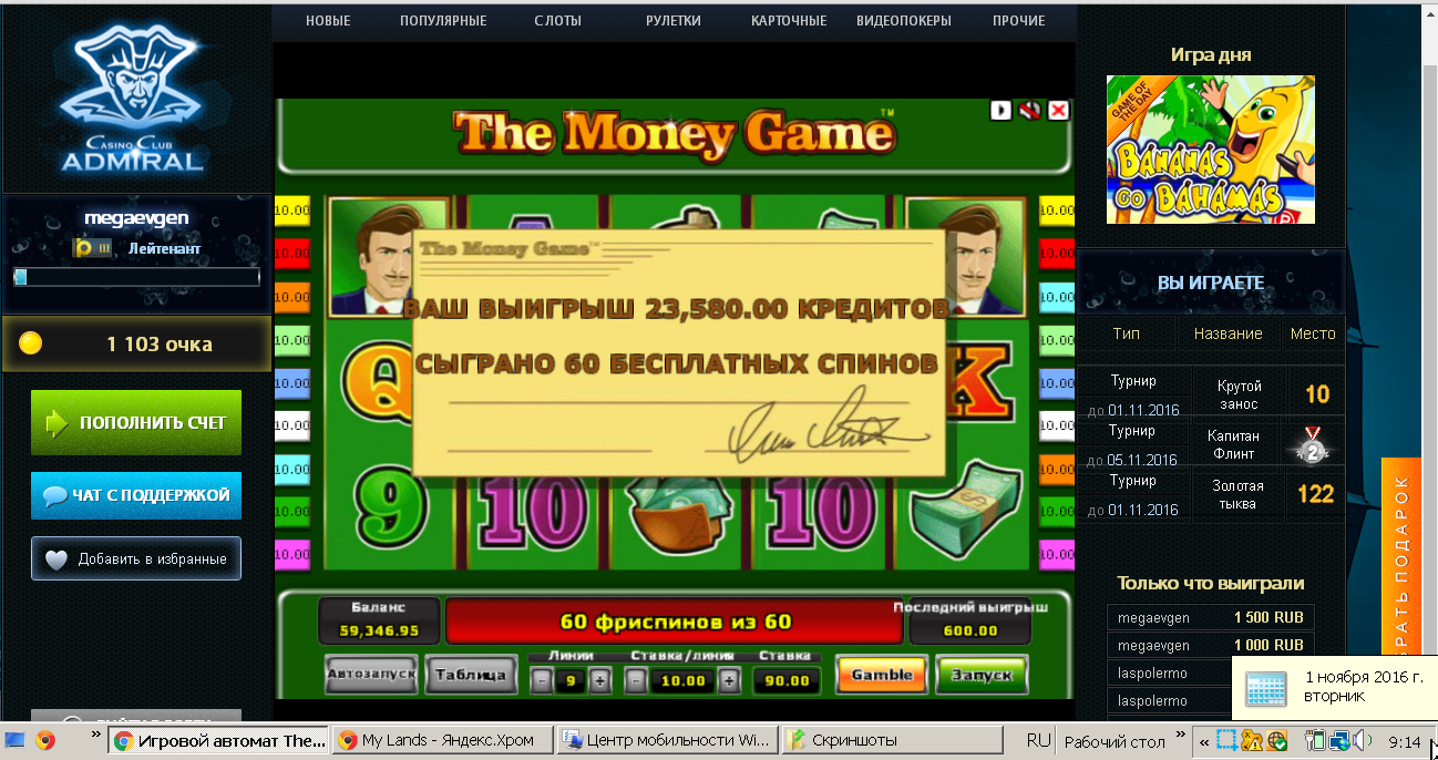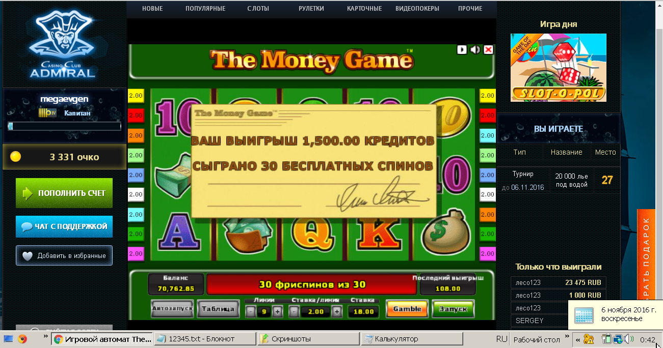 Наибольшее число баллов набрал Megaevgen, а игра The Money Game принесла ему наибольшее соотношение выигрыш/ставка - 262:1, этот занос запечатлён на скрине: