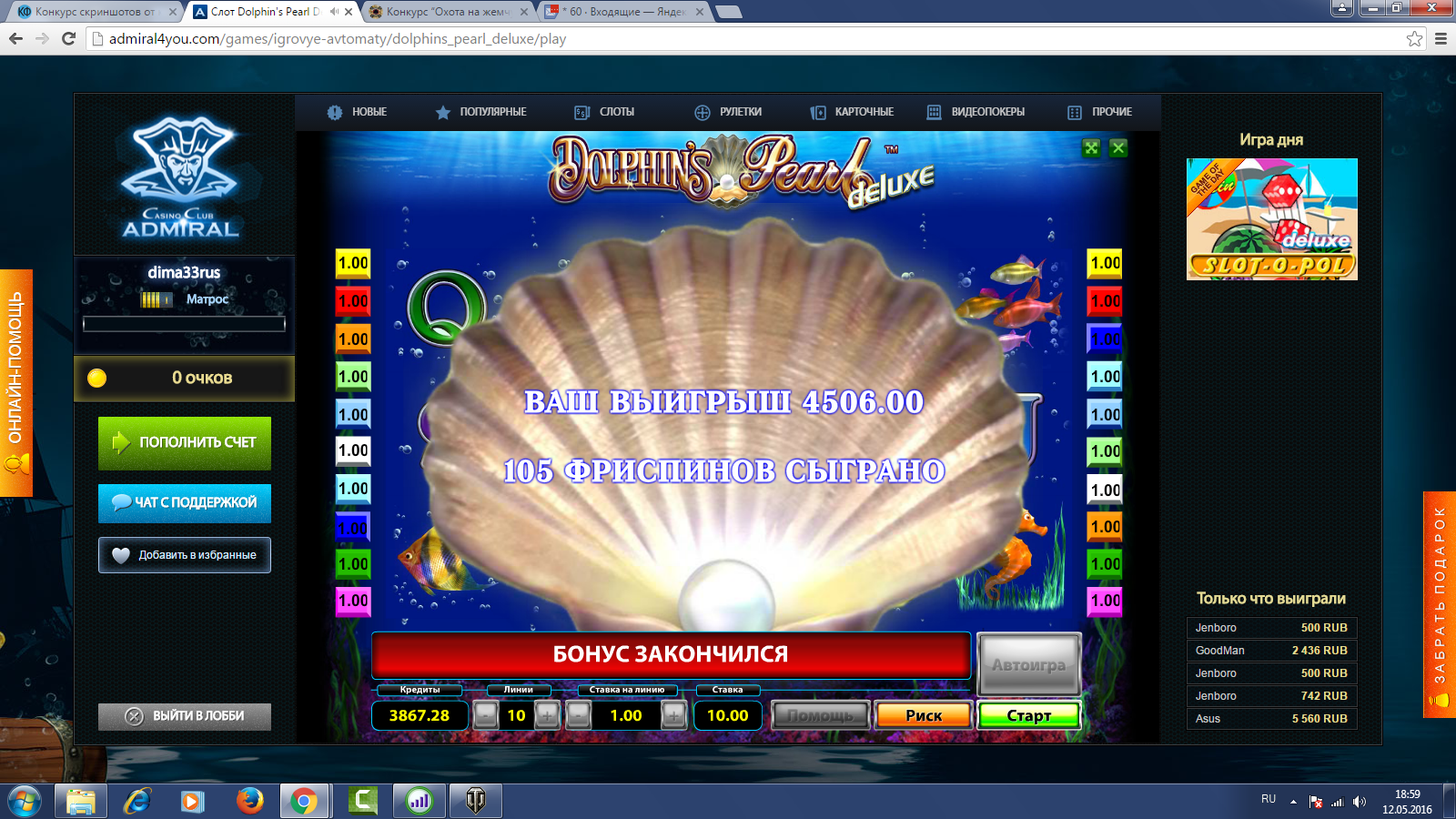 Dolphin’s Pearl Deluxe, выигрыш в которой составил 5127 рублей, при ставке 10 рублей за вращение.