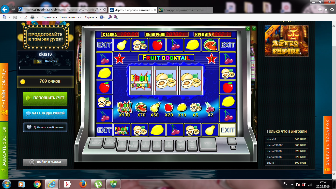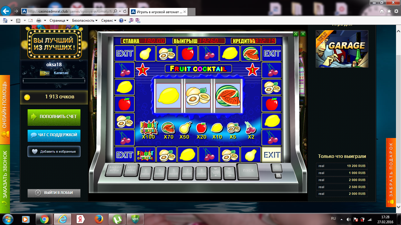 Наша победительница сыграла в Fruit Cocktail и выиграла более 12000 рублей при ставке 90 рублей за спин: