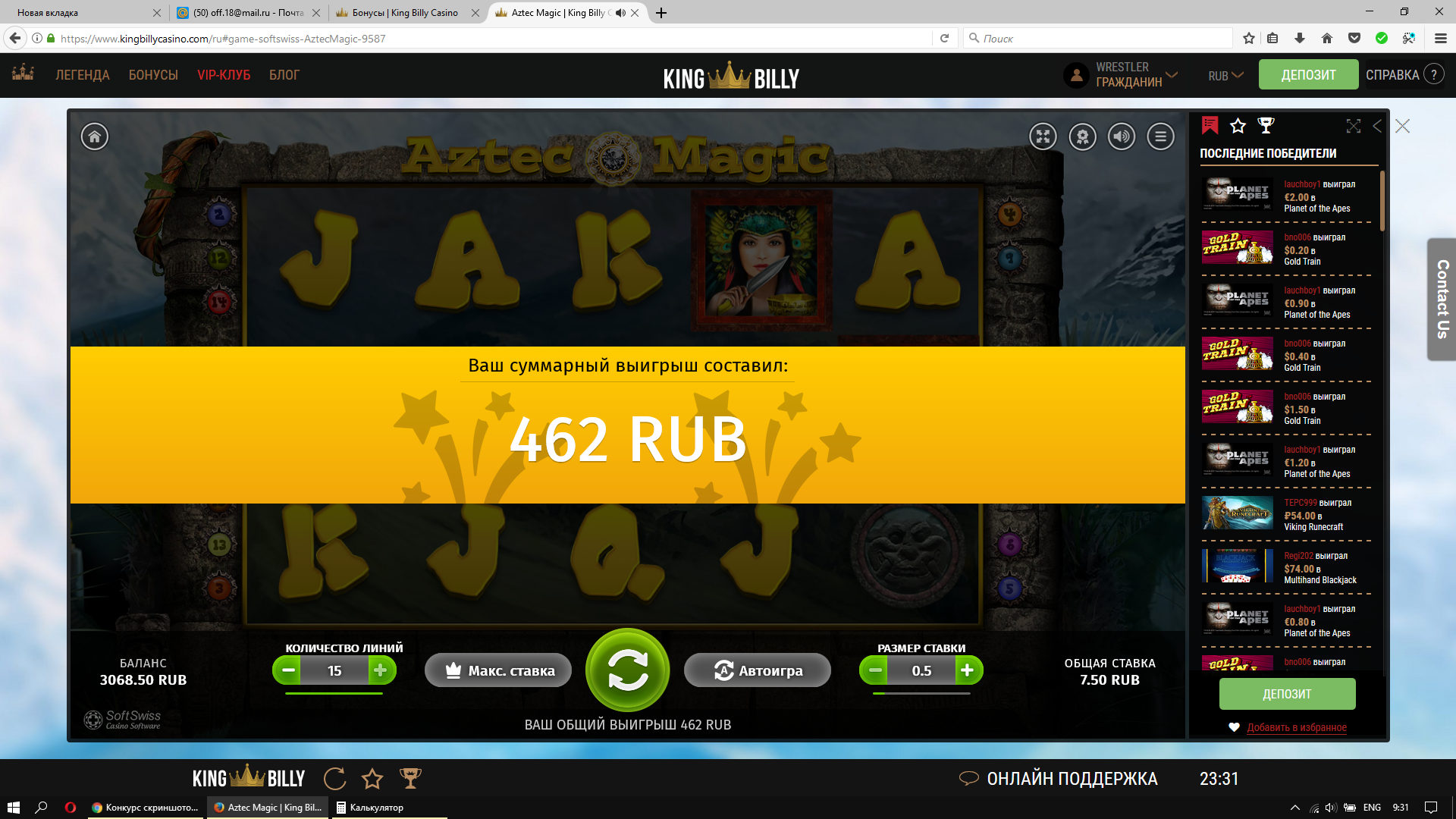 х78.5 - Но тут какой то казус с казино произошел, только выпала комбинация, меня сразу же выкинуло на главную страницу, тем самым я не успел сделать скрин где зафиксировалась бы сумма выигрыша.