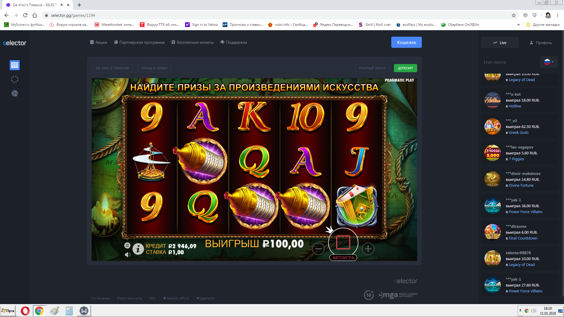 W win888 Доминатор Вайлдов Проверенный 24 Окт 2018 418 63 61 Credits ¢1,303 11 Янв 2020 #47 х56 #Selector_mycasino Вложения Скриншот 11-01-2020 213638.jpg 930.3 KB Просмотры: 362 Последнее редактирование: 11 Янв 2020