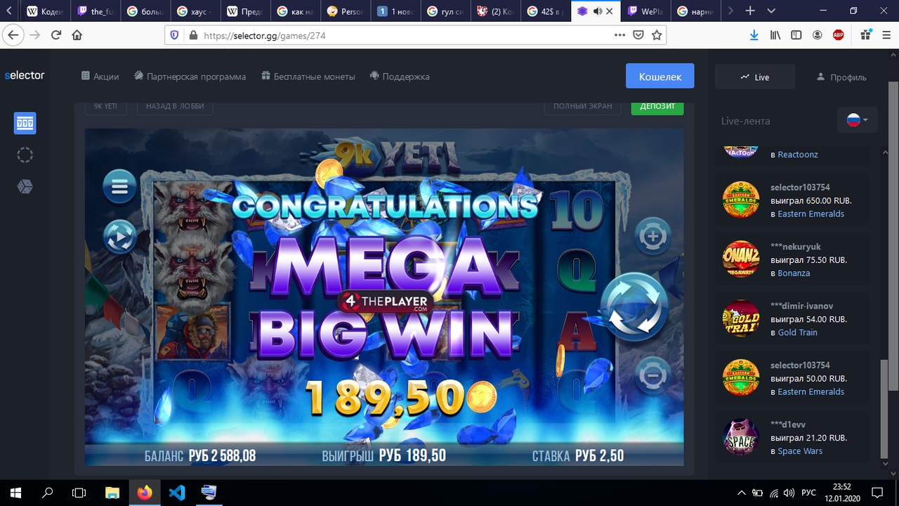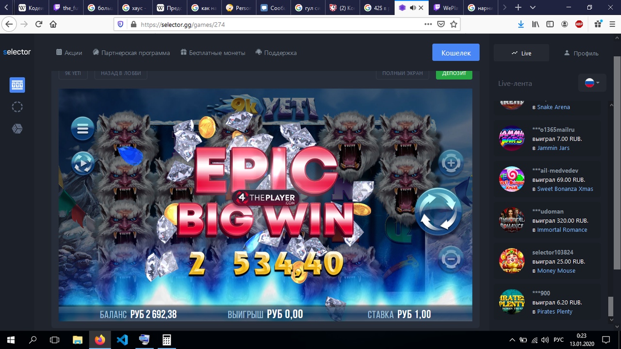 widsgames Агент Респинов Проверенный 5 Сен 2017 2,099 118 Credits ¢6 13 Янв 2020 #158 Mavericksss написал(а): x428 #Selector_mycasino Нажмите для раскрытия... Меньше гораздо. Ставка 1.руб. 20 линий,значит общая ставка 20 руб. выигрышь 428 руб раздели 428 руб на на 20 р.Получается х21 всего. Последнее редактирование: 13 Янв 2020