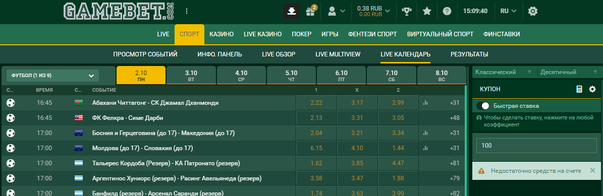 На live календарь нажми и выбери, на что ставить)Помогите разобраться. Активировал бонус. 580 рублей. Далее нажал на спорт. Первые игры пишет только 7 октября. А 9 уже все сгорит. Ставлю ставку,а она не делается. Недостаточно средств пишет. А там нет по раньше спорт событий кроме как 7 октября ? Посмотреть вложение 27629 Посмотреть вложение 27630
