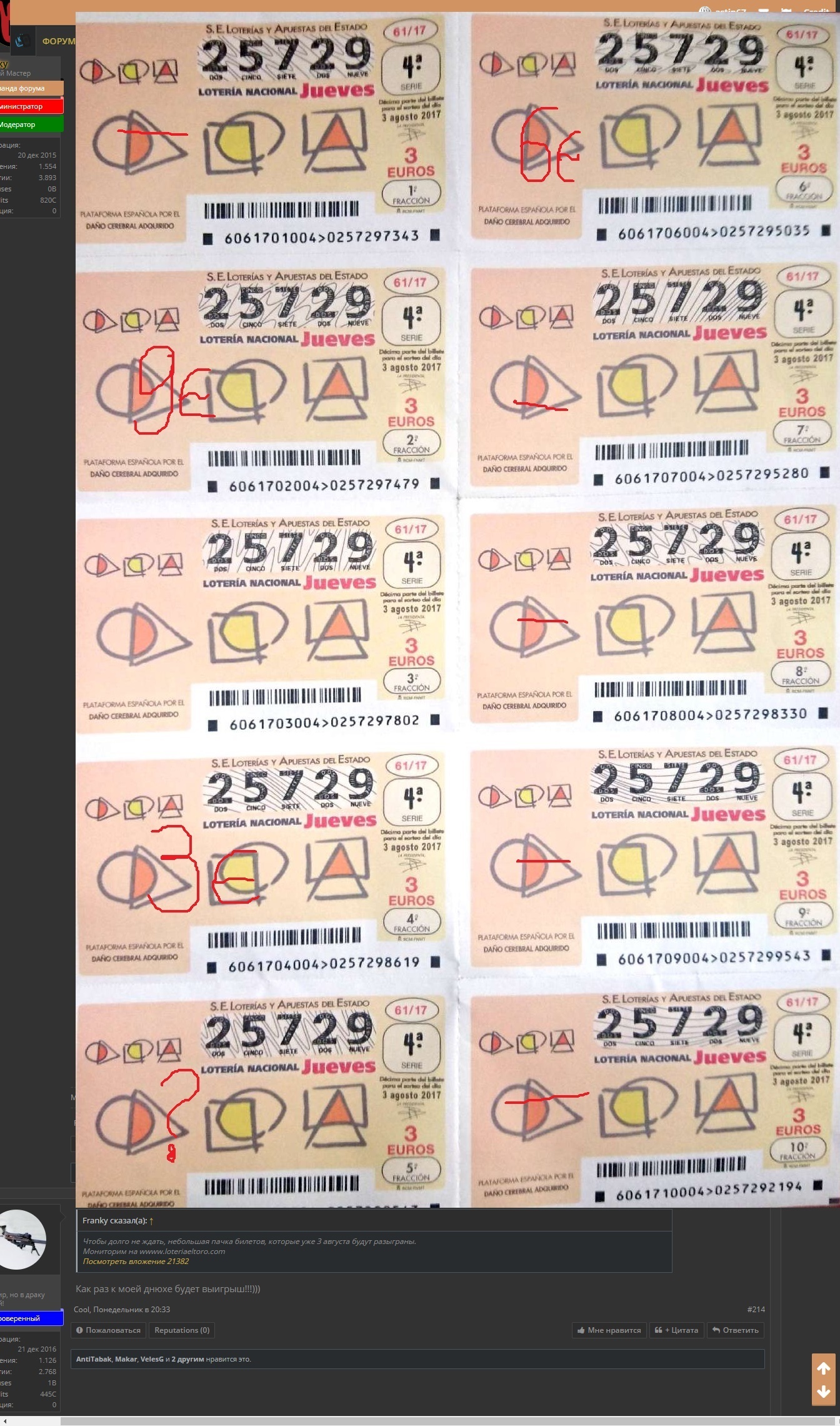 Слежу за етой темой давно ! Ну что миллионеры выиграл хоть 1 билед или нед ? было приятно услышать что б хоть 1 билетик сыграл , и как же мизерный выигрыш будете распределять среди толпы людей закинувших мизер подобно мелкому выиграшу с билета ? .я вот вам бы предложил идейку - если с етих всех билетов френки не удасца выиграть крупный джекпот , пустите все деньги если по мелочи он выиграет на стрим с перспективой преувеличить данную сумму в крупнее и уже потом по доле разыграть !( Это если не выиграете МИЛЬОН! )