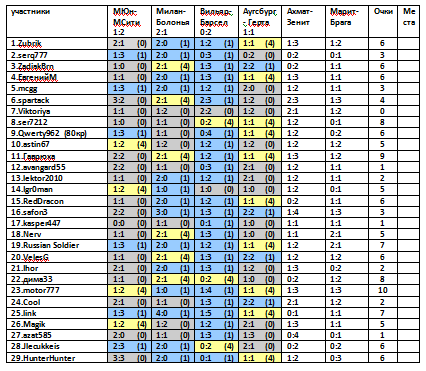 Господа,если кто заметил какую неточность не стесняйтесь отмечать это. Цифр много, но в итоговой таблице ошибок не будет, так как каждый результат после сыгранных матчей сверяется. Спасибо за понимание и содействие.