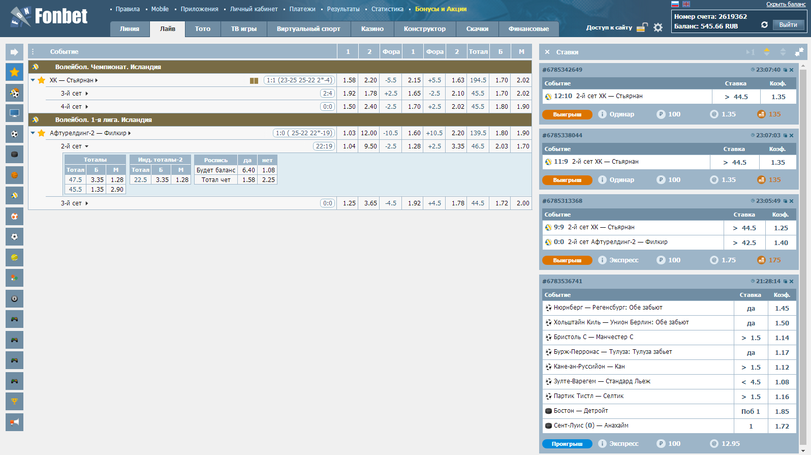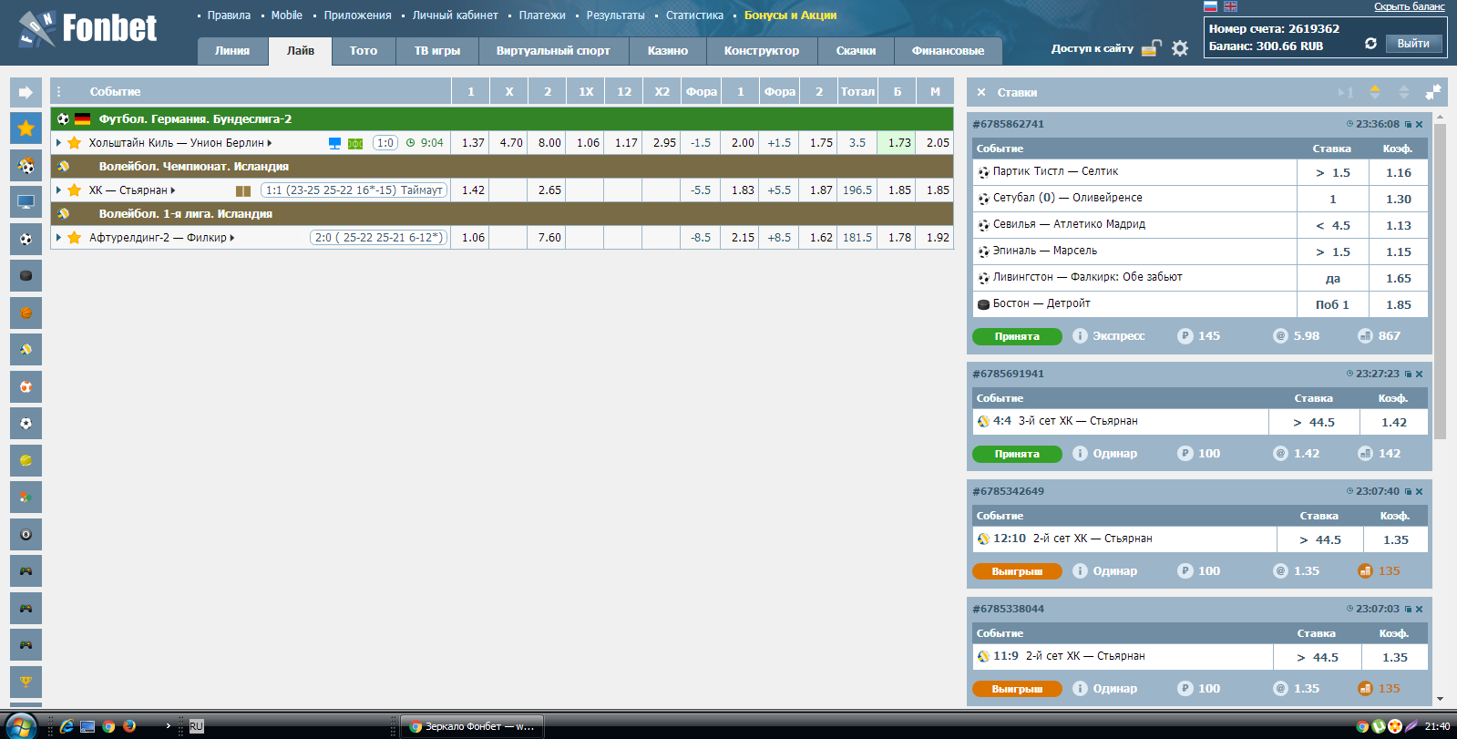 Бой веду в БК Фонбет. Экспрессы сдохли из-за Тулузы итить, но ещё поставил. Волейбол - даёт пока остаться на плаву....Всем удачи!
