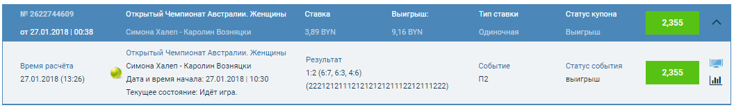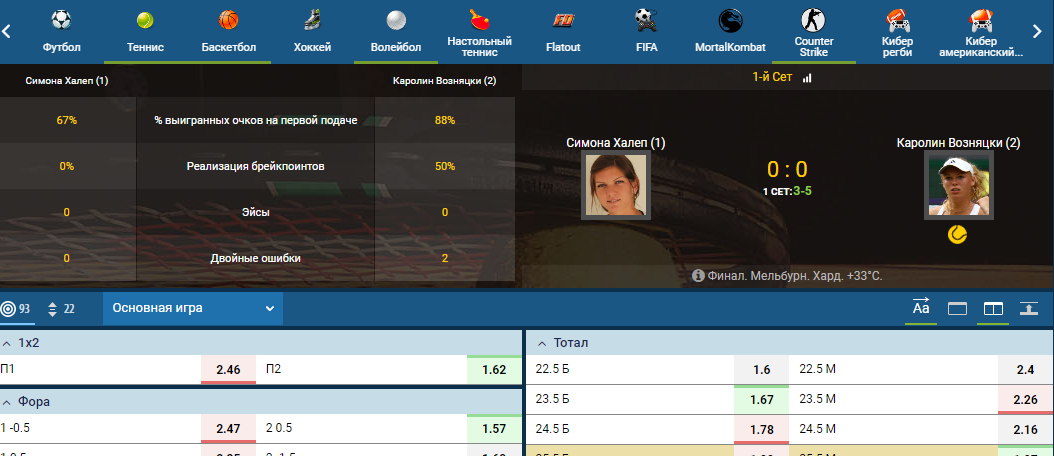 а я жду когда Каролин первую подачу возьмёт.может,кеф на Халеп повысится,а то за 1.71 заходить не хочется..)