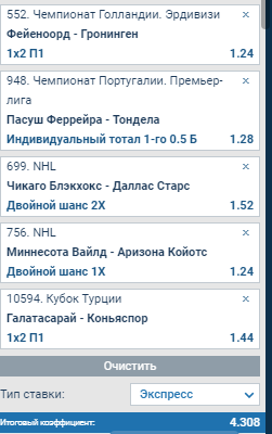 а если разделить на два пресса?скажем,НХЛ отдельно,футбол отдельно рублей по 300?если зайдет,все равно подъём будет,но так хоть обезопасимся немного...волшебно вчера с Испанией отскочили,в следующий раз может и не повезти.просто стараюсь риск к минимуму свести.лучше +10,чем -400..)тем более железок,как я понимаю,нет..