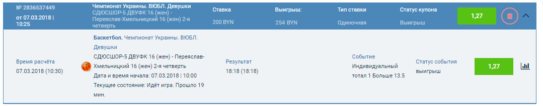 Вот кстати в подтверждение ставка только что в лайве на баскет (этот вид спорта как футбол предпочитаю):