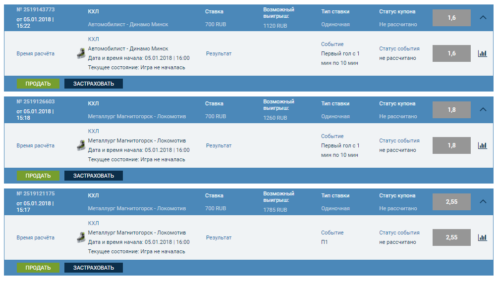 со временем, кэфами и сумой ставок