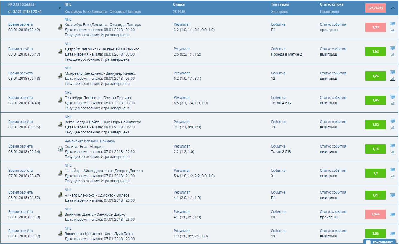 Хоккей вообще не предсказуем,но тем не менее 80 процентов ставок я делаю именно в хоккее,вчера ставил вроде на ВЕРНЯК, подвела МХЛ команда ,,Капитан,, которая на последнем месте в турнирной таблице взяла да и выйграла, а Тихий взял да проиграл из за них)! У тебя должно зайтиРебзя зайдет или нет у меня?