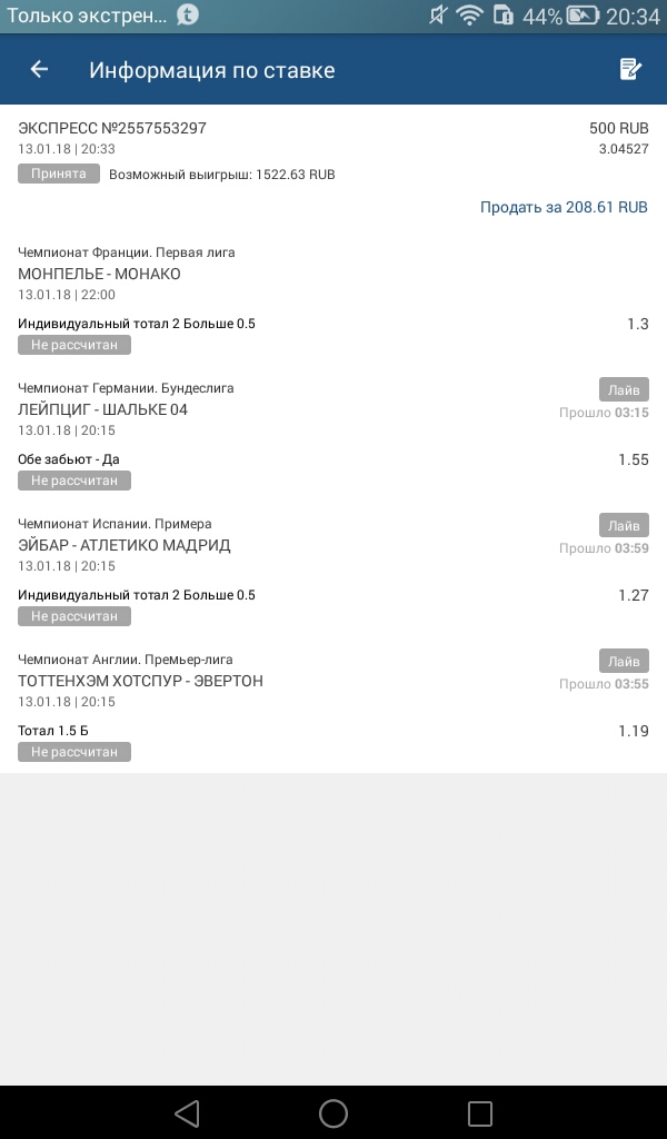 в общем что успел ва банк.все мнения из экспресса Антипа.они там постоянно матчи закрывают.один закрыли,и уже невозможно поставить.ну да ладно.штука выигрыша если что тоже неплохо.зато вероятность прохода повысилась...)Screenshot_2018-01-13-20-34-11.jpeg