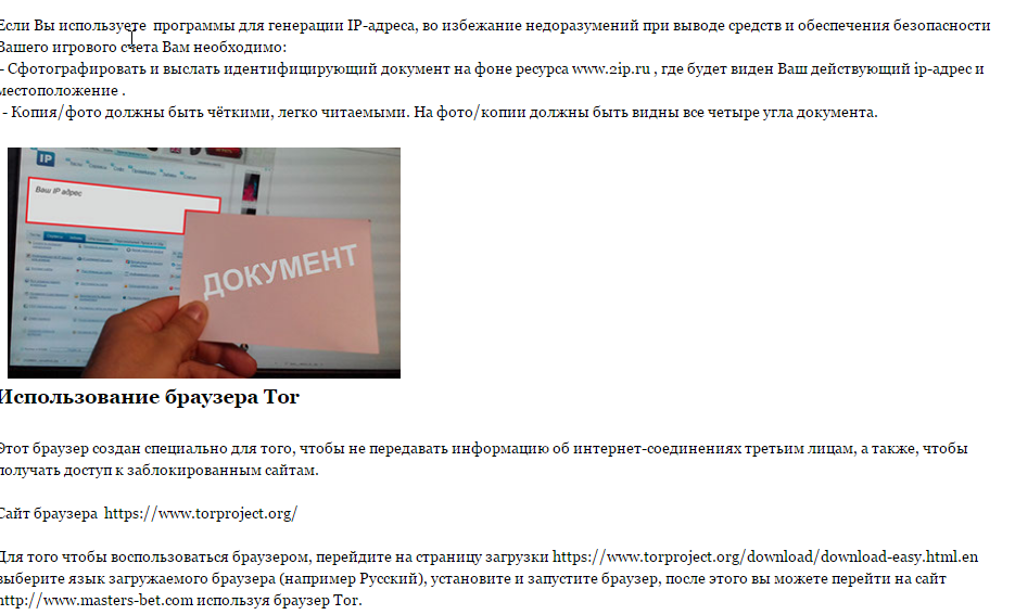 Настоящие условия могут быть изменены и дополнены в любое время. Компания оставляет за собой право отказать в участии и предоставлении бонуса без объяснения причин в случае, если во время проверки игрового счета возникнут подозрения в нарушении честности игры (множественные регистрации, участие одного участника с разных аккаунтов, регистрация фейковых счетов и аккаунтов) или применении других стратегий, которые компания по своему усмотрению считает злоумышленными. В спорных ситуациях решение администрации является окончательным. Ссылка конторы http://www.masters-bet.com/#/