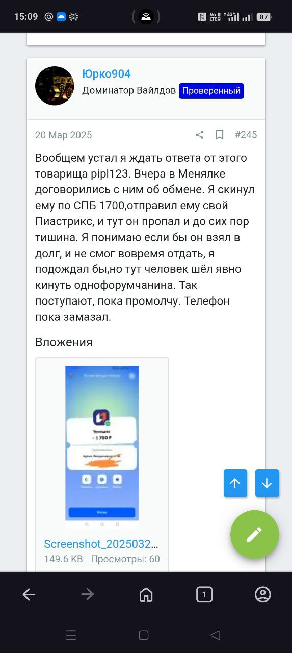 Да у меня изначально были сомнения первый раз отказался, чуйка была , срочно необходимо было на пиастрикс второй раз согласился, уже прочитав его сообщение убедился в этом как ты и пишешь никто с ним не обменивался да и суммы он писал на порядок больше в некоторых случаях, так то сам мог вывести на карту с меньшей комиссией . Сколько зарекался вторым переводить, нет мля верю сука до последнего в человечность .. Пусть подавиться выше на писал не жалко надеюсь он их на это и потратит, 6 лет сидеть на форуме чтобы 1к кинуть ...