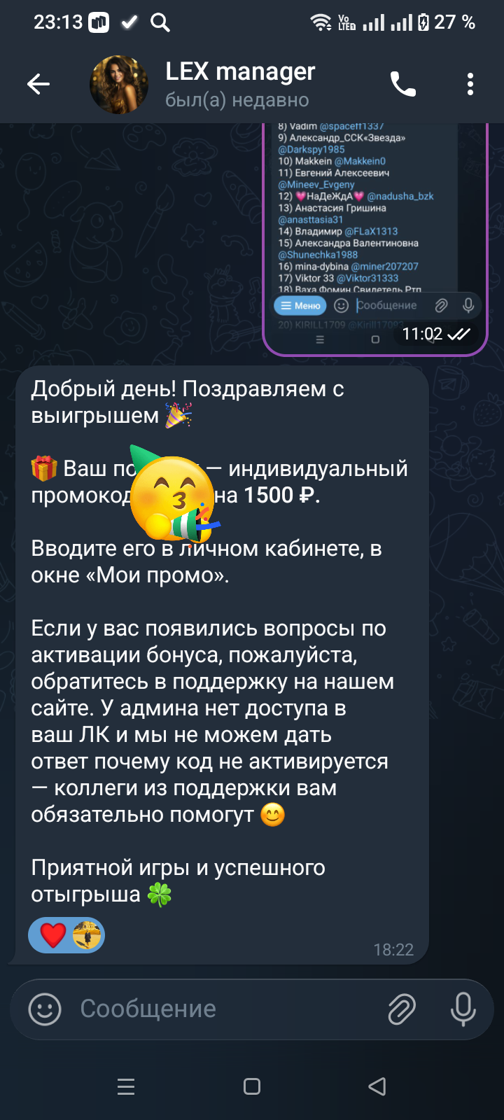 В казино LEX выиграла промо на 1500р, но активировать не могу, там деп нужен за месяц 20к. Могу отдать его, если кто-то удачно отыграет, поделитесь со мной выигрышем, либо обменяю на промо покердом или r7