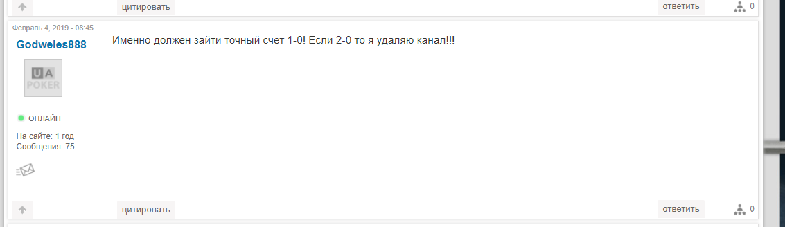 Человек обещал на сайте юапокер (условное пари было с пользователем), что удалит свой канал, если не зайдёт счёт 1-0 в матче динамо бухарест или если хотя бы не зайдёт один его прогноз. Счёт не зашёл, победа динамо и ТМ2.5 не зашло. Вот его слова: "ЕСЛИ МОЯ СТАВКА НЕ ЗАЙДЕТ ТО Я УДАЛЯЮ КАНАЛ-СЛОВО МУЖИКА! Если у меня заходит точный счет 1-0 вы ПОДПИСУЕТЕСЬ НА КАНАЛ И ЕЩЕ ПРИВОДИТЕ ПО 10-20 ЧЕЛОВЕК??? ИДЕТ??? "