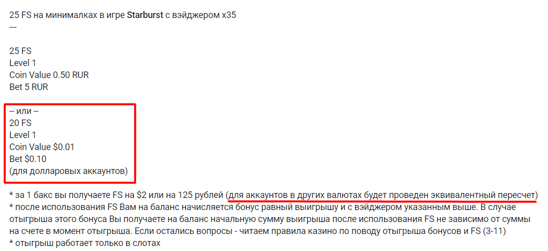 Сегодня купил - 25 FS в игре Starburst. Wager x35, только начислили почему-то только 20. За то на 4-ом фриспине: