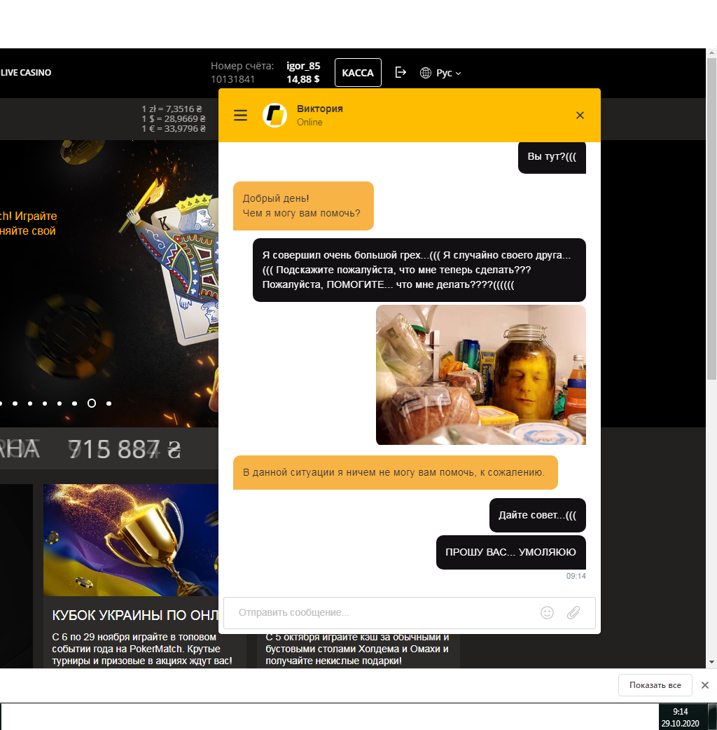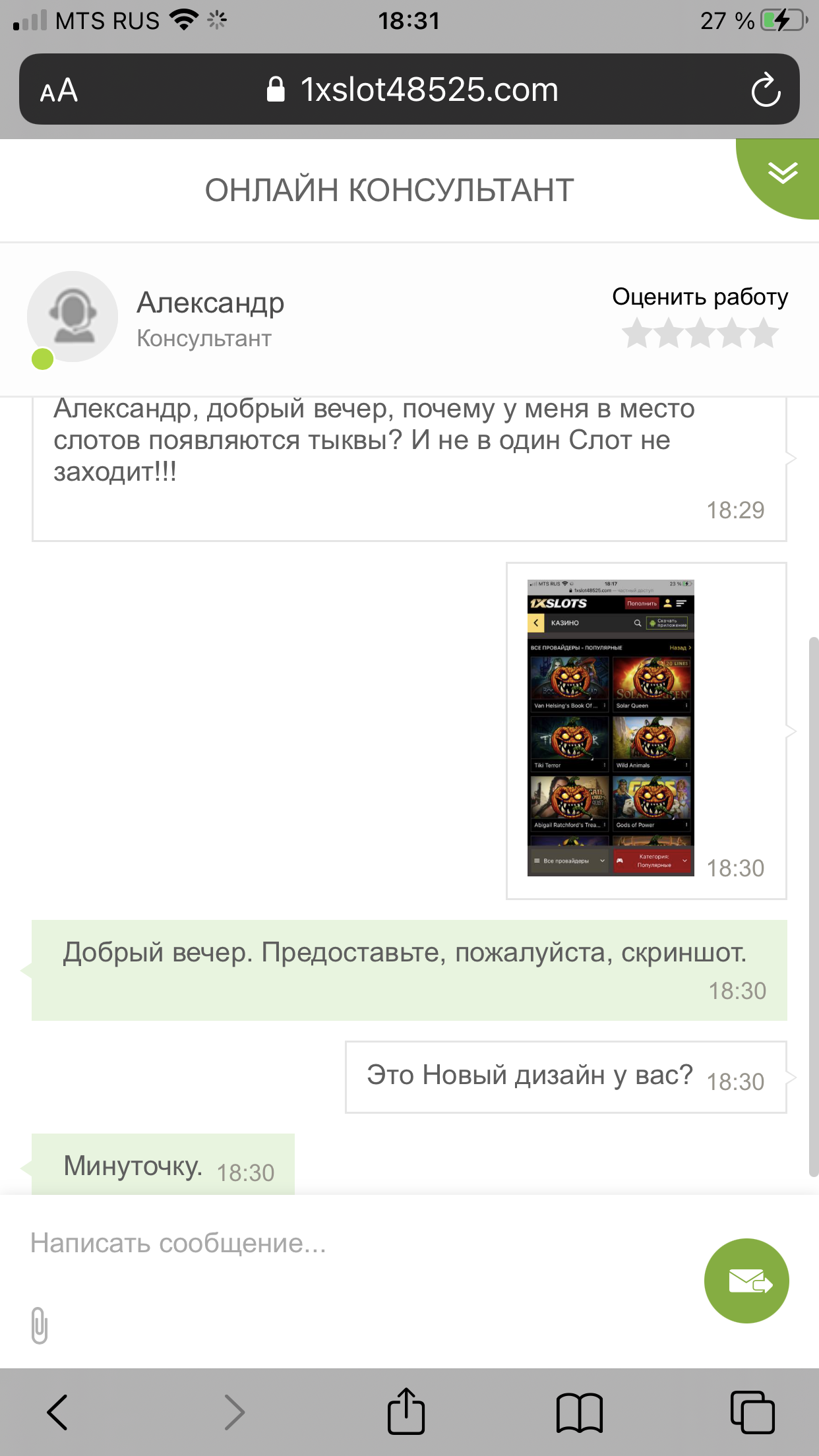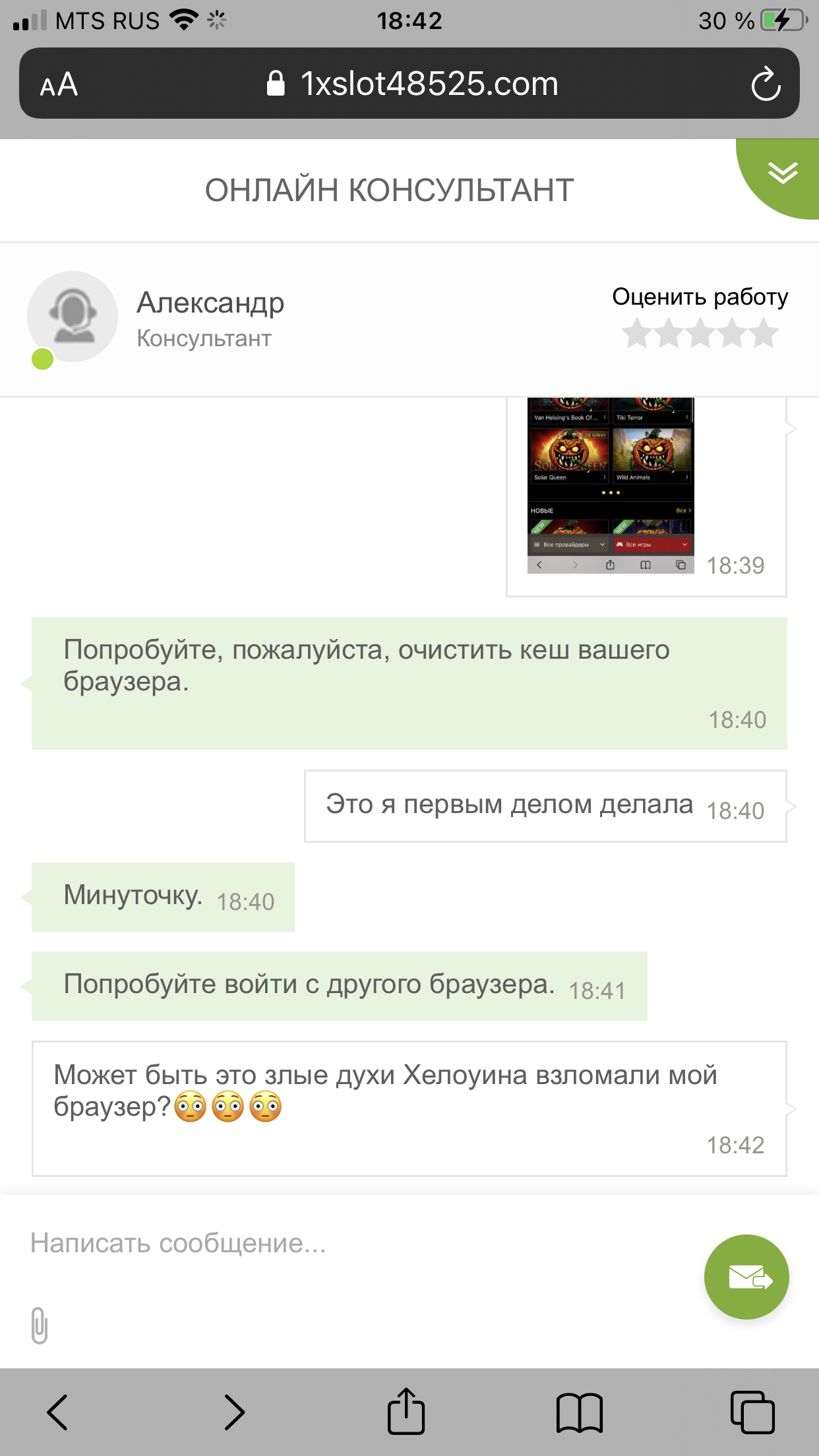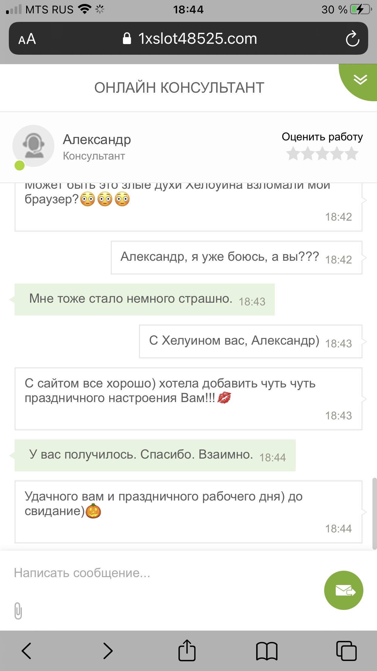 играю в общем в слоты и тут бац на весь экран какая то тыква стращная появляется на экране и вместо глаз у нее дырки а в них горит свеча и имя светиться Константин и что то непонятное мелким шрифтов написано ну типо предупредить я должен Онлайн консультанта об опасности