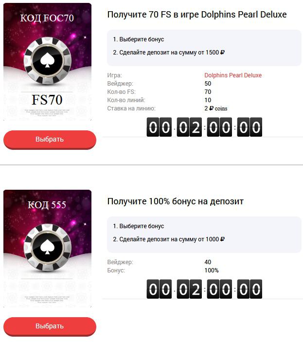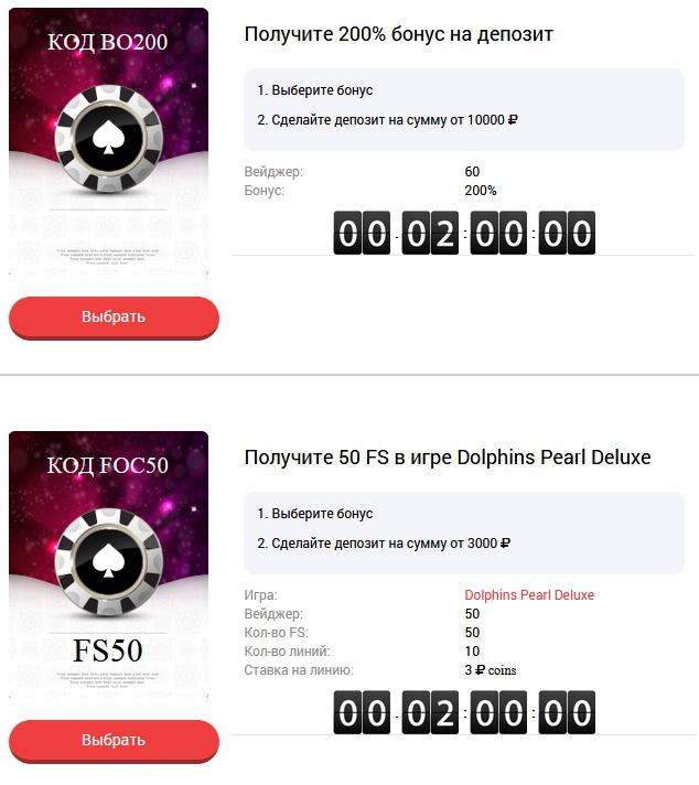 Так же любой игрок может получить различные бонусы или фриспины на депозит с минимальными требованиями оборота,50%, 100%, 200% или 50FS, 70FS, все бонусные коды можно выбрать и активировать в разделе Касса.