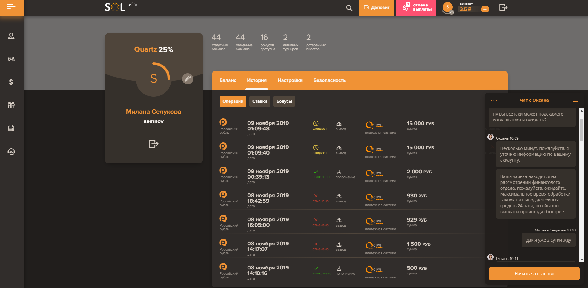 играла в данном казино получила бездепозитный бонус но проиграла его, сделала депозит 500 рублей выйгрола с него 1000 верефицировала аккаунт поставила выплоту, спустя пол дня выплоту отменили сказали вы не прокрутили депозит х3 затем я его прокрутила оформила снова выплоту спустя снова пол дня выплоту опять отменили сказали вам ещё нужно сделать депозит 2000 и открутить х3, я его сделала открутила выйграла 30000 рублей оформила выплоту и всё выйгрыш так и не выводят идут уже 2 сутки а в чате пишут ждите максимальное время выплоты 24 часа, хотя они уже вышли