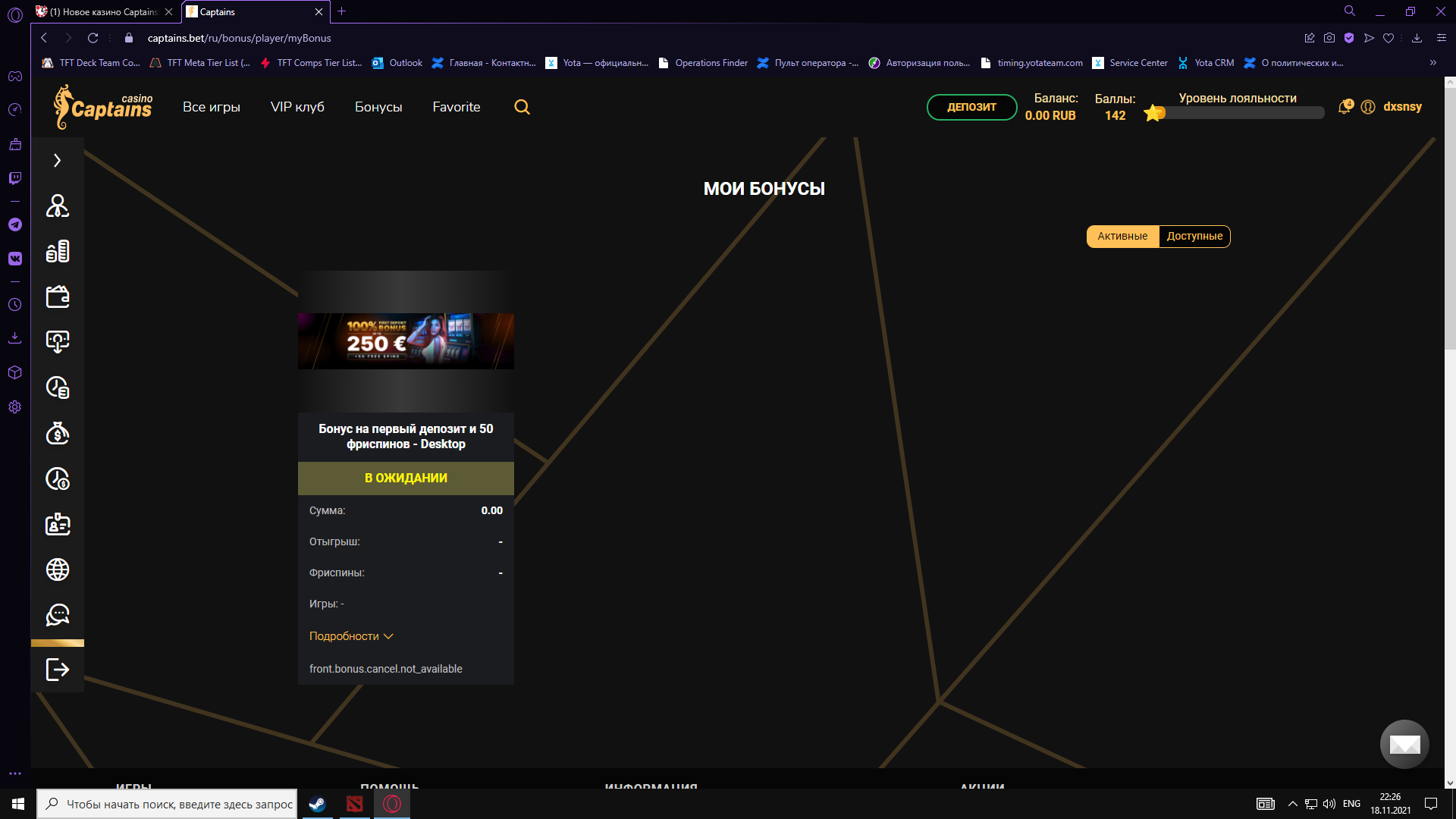 при депозите в открывшемся окне есть ли опция бонуса на 1-й депозит?В активных да, правда только спины, 100% - не появился. Хотя вчера ночью еще проверял - не было.