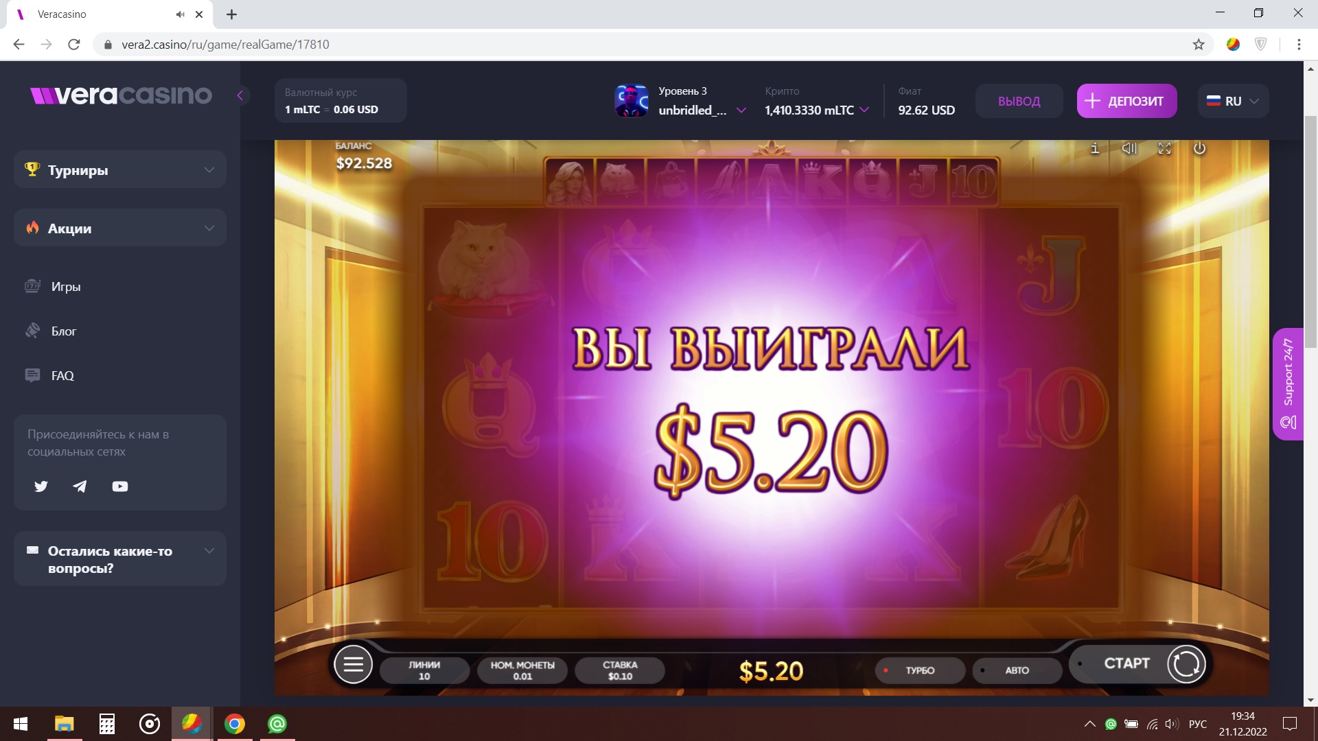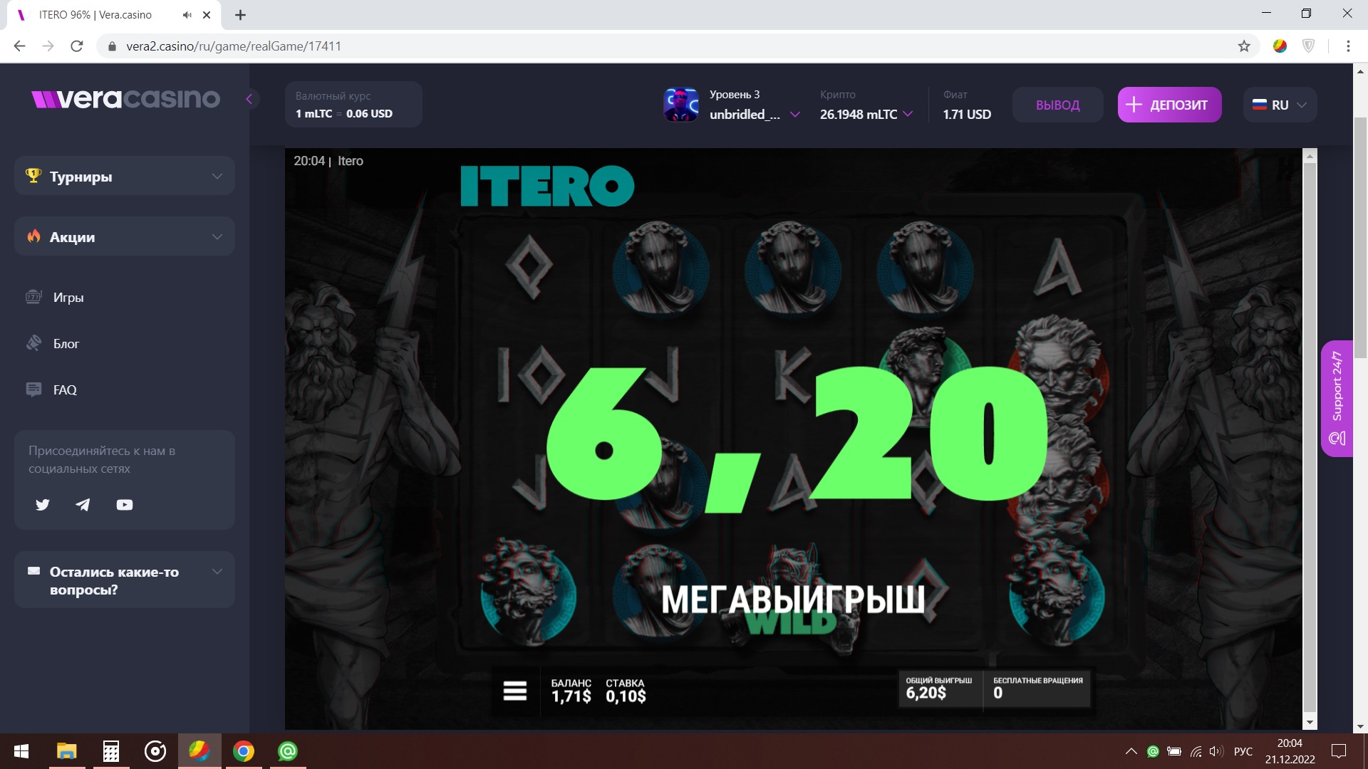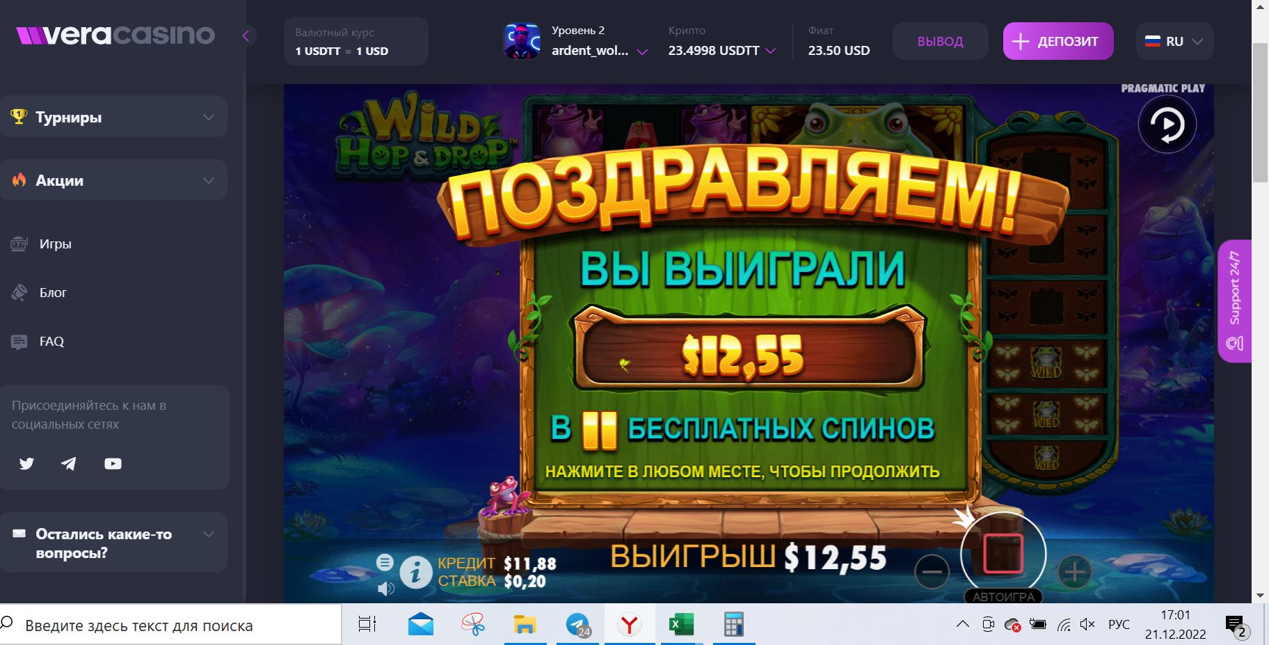 3) 500$ на баланс >>>казино Vera<<< без условий по выводу, получит первый кто поймает занос ровно х2022 или х2023 в этом казино, если такого заноса не будет, то приз будет составлять 200$ и заберет его тот, кто будет ближе всего к такому результату в этом казино по итогам конкурса! - ближе всего @Спортсмен с х2224
