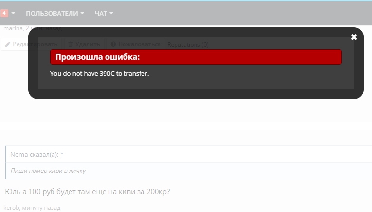 Тихий, денечек потерпи, обменяю) я рыба заливная)Если есть у кого возможность и желание, поменяйте мне 700 кредитов на 333 рубля киви.(если чё в личку напишите)