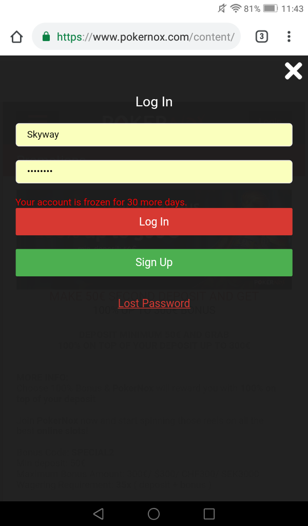 Только зарегистрировался и тут же пишут, что мой счет заморожен на 30 дней. Я таких оленей еще не встречал)). Ну и ладно, не велика потеря, явно неадекватное казиноScreenshot_2018-11-13-11-43-55.png