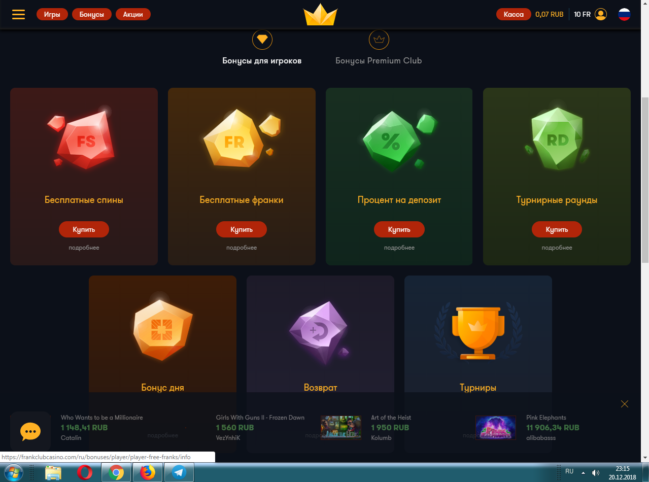 Мне дало 50еврико в бонуске, потом ещё 10. Сказали вагера нет, депозит нужен и подтверждения моб. телефона. У меня почему-то киви не работает на их сайте, скрилл норм и вэбмани, а киви ошибка платежа!)Насыпали 5 бакинских, необходимо было в этот же слот 120 открутить, но, как обычно, все сожрало без компромиссов..)