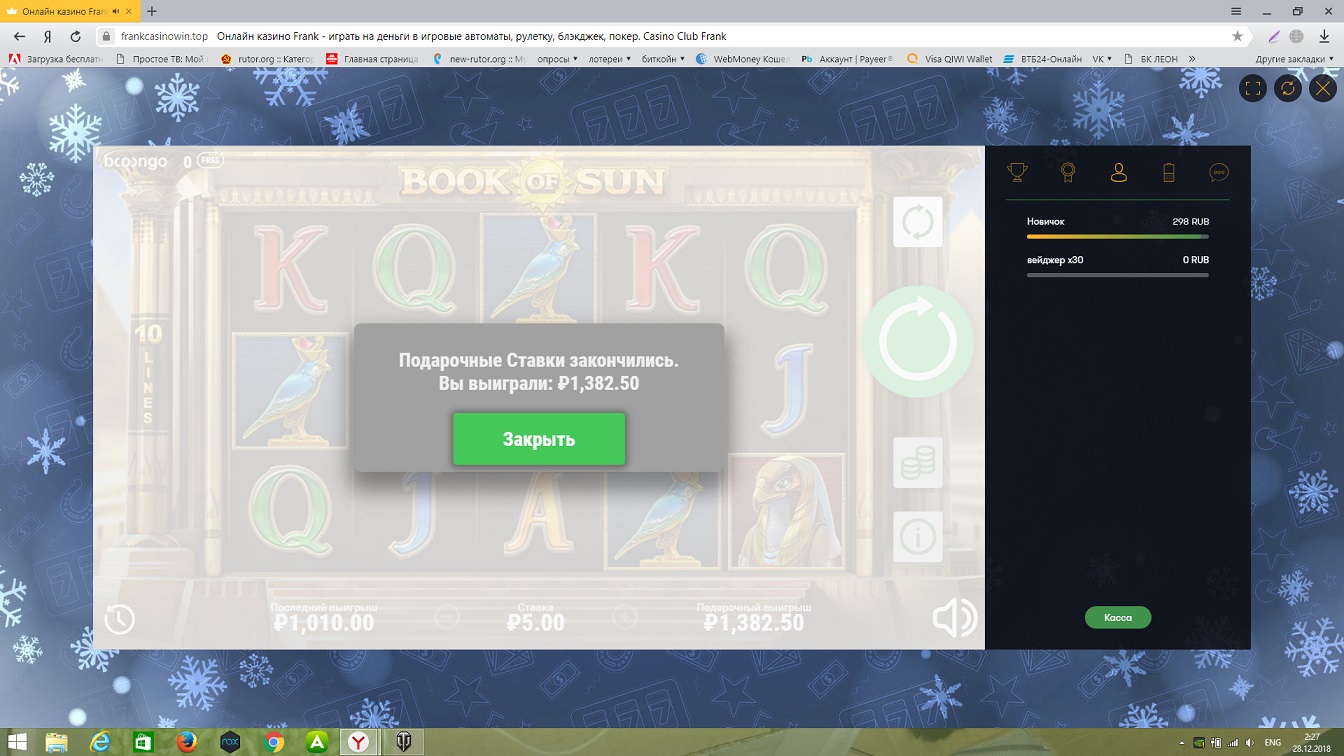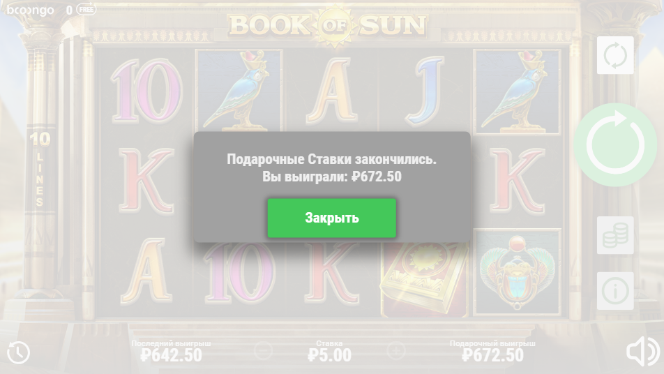даёт 25 спинов в слоте Book of Sun по ставке в 5 рублей. на последнем спине упал бонус