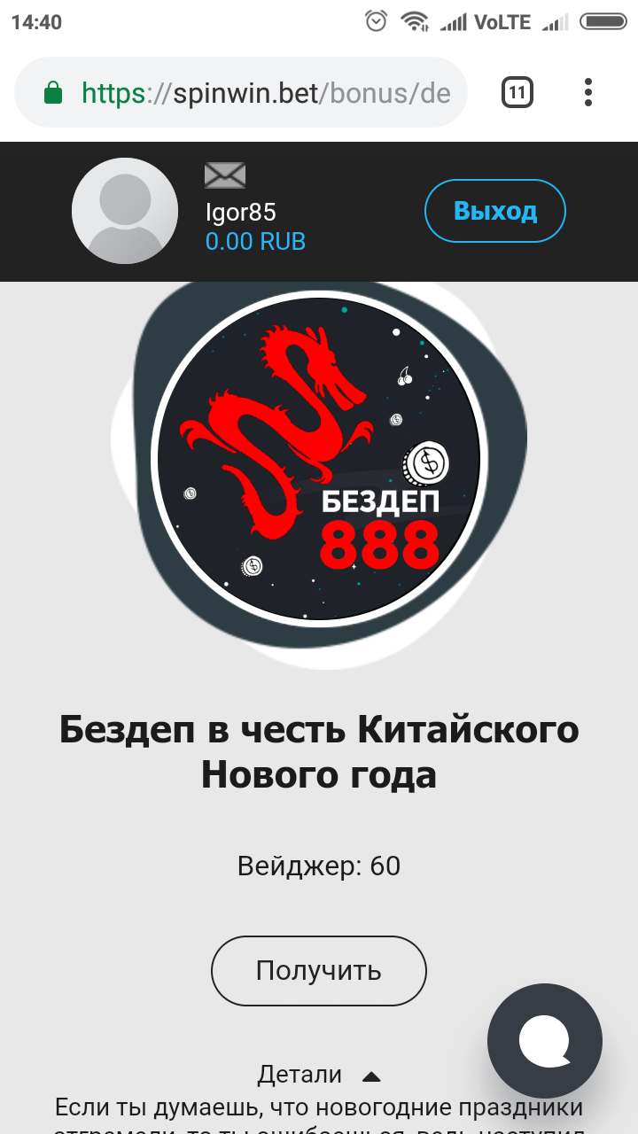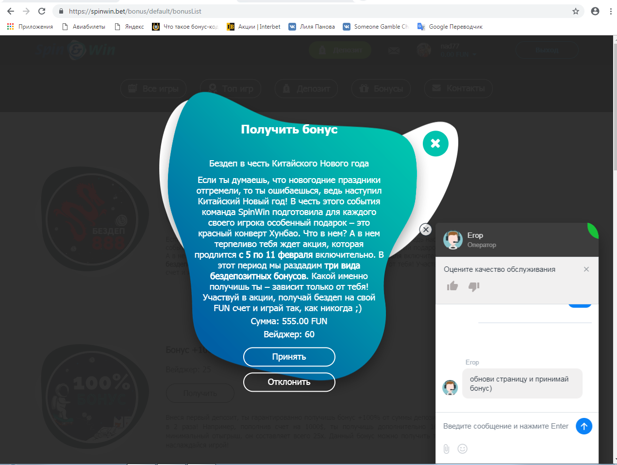 Я когда нажал кнопку получить, в лайф чате мне сам Толик написал, мол, хотите 888 бездеп... Я ответил, что хочу... После этого Толик пропал и не выходит на связь..) Может думал я откажусь...!?)))