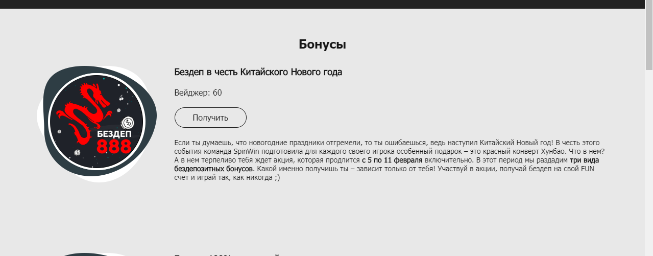 Приветствуем тебя, наш друг! В преддверии Китайского Нового года команда SpinWin приготовила для тебя подарок – красный конверт Хунбао. Открыв его, новички, которые не вносили ни одного депозита, смогут получить бездепозитный бонус в размере 555 рублей с вейджером 60!