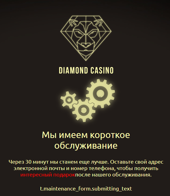 Попробуйте сейчас в аккаунт зайти.Там тех работы и обещают какой то подарок по окончании,надо ввести почту и телефонhttps://diamondcasino.africa/en