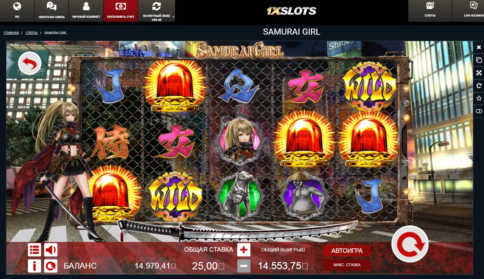 Депнул с утра 250р в 1xSlots Casino, заметил новый слот Samurai Girl от провайдера Ganapati, минимальная ставка 25р, подумал дорого для моего депа, но решил немного покрутить и буквально сразу поймал бонуску )) Насыпало неожиданно прилично - х582!