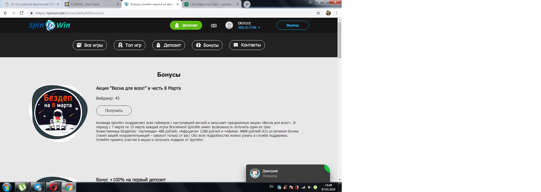 берем бонус пока в чате есть кто то депов не было дали spinwin казино
